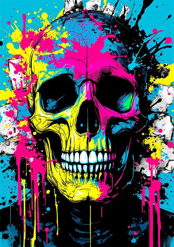 Un crâne qui explose de couleurs, comme une nuit électrique sur un mur de ville. Ici, le noir tranche net, les éclaboussures fuchsia et jaune claquent comme des néons, et le bleu turquoise ouvre l’espace avec une énergie presque musicale. C’est une affiche qui ne chuchote pas : elle affirme, elle réveille, elle met du rythme dans la pièce.