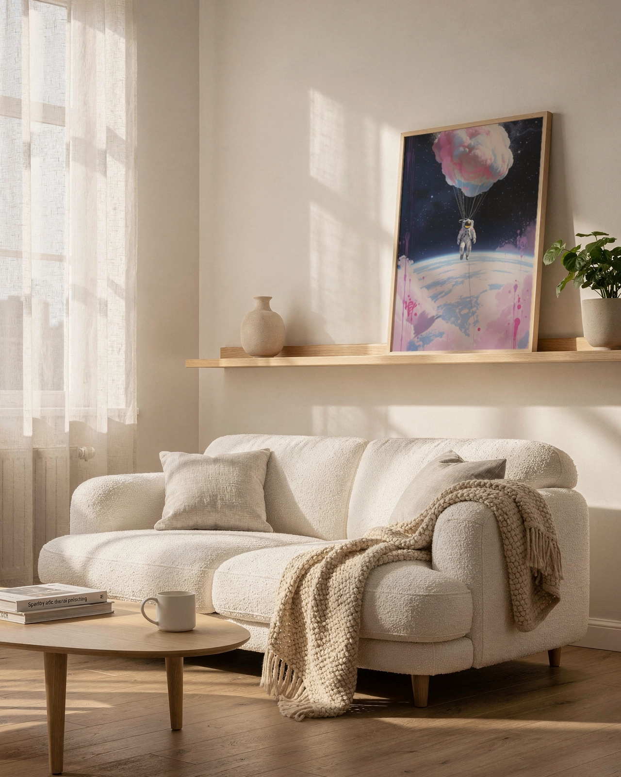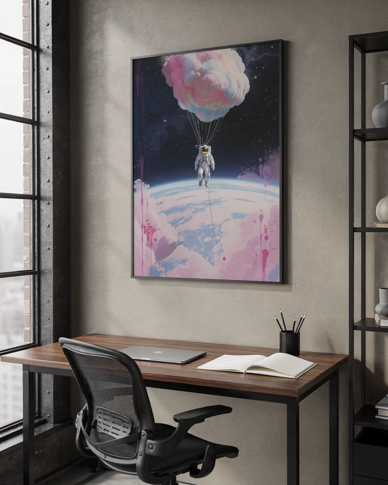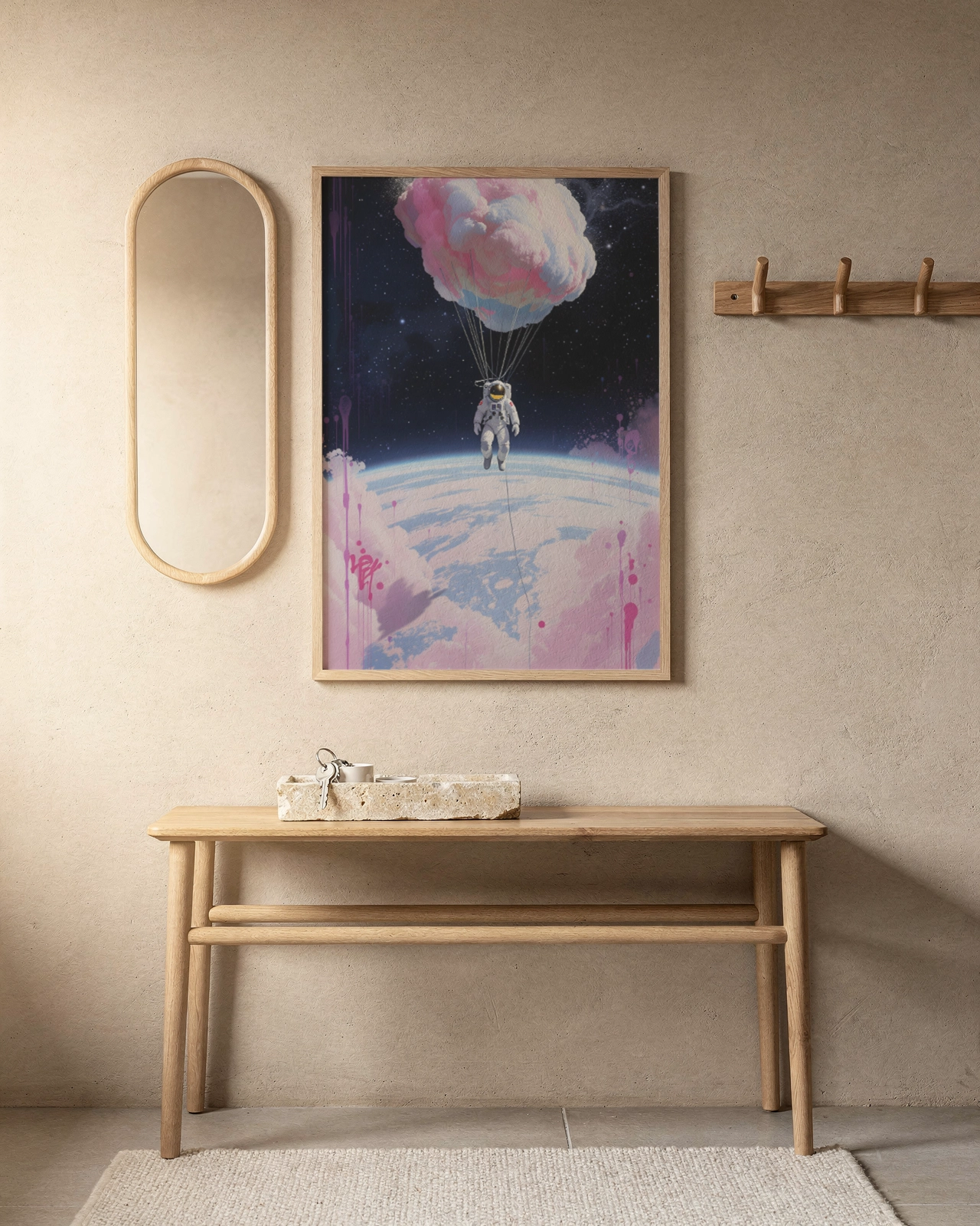 Son univers mêlant inspiration spatiale et atmosphère légère s’intègre parfaitement dans une décoration contemporaine, minimaliste ou design. Elle fonctionne particulièrement bien en grand format jusqu’au A0 pour un effet plus enveloppant sans surcharger la pièce. Une solution simple pour donner du caractère à votre intérieur et installer une ambiance inspirante au quotidien.