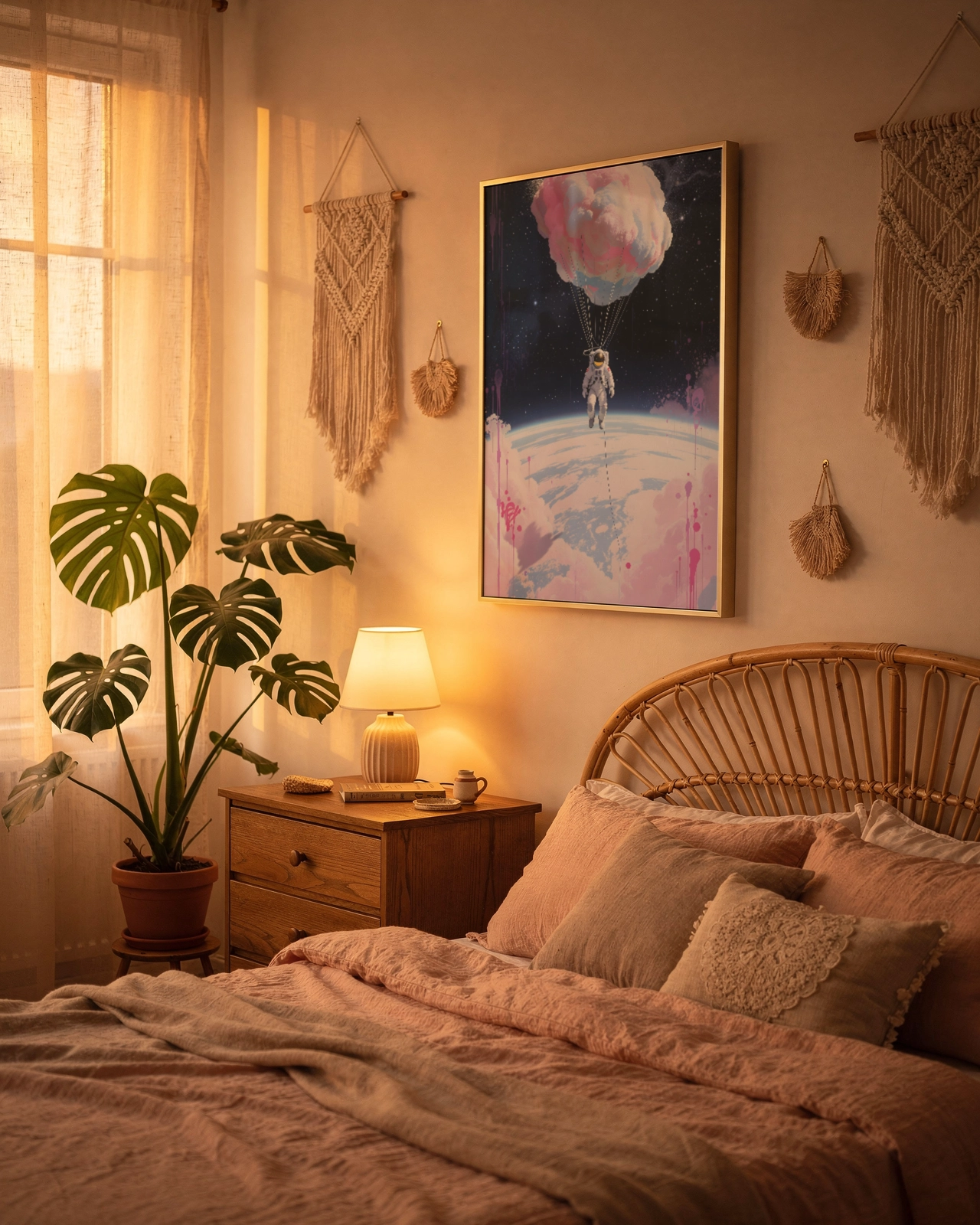 Dans un salon, une chambre ou un espace créatif, cette affiche apporte une ambiance douce et immersive. Elle transforme un mur vide en point focal apaisant et crée une sensation d’évasion tout en conservant une esthétique moderne.