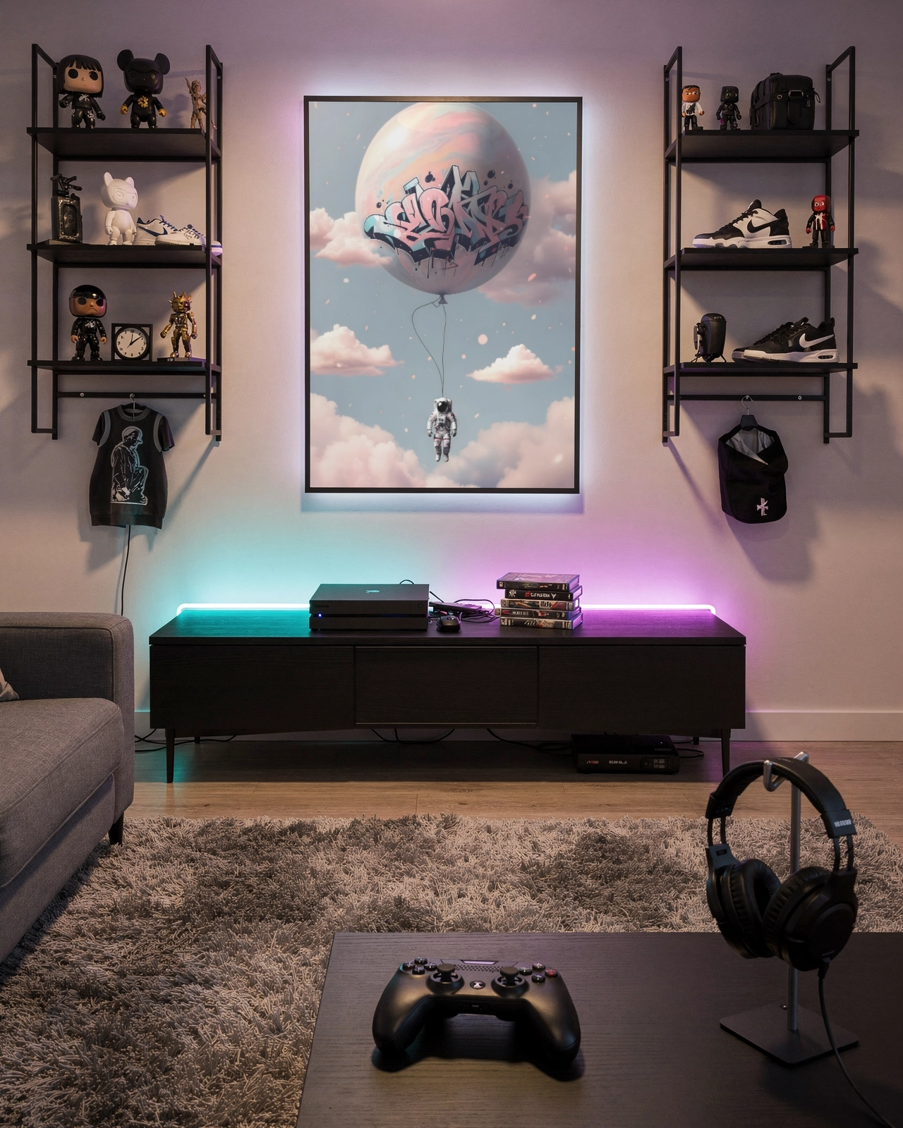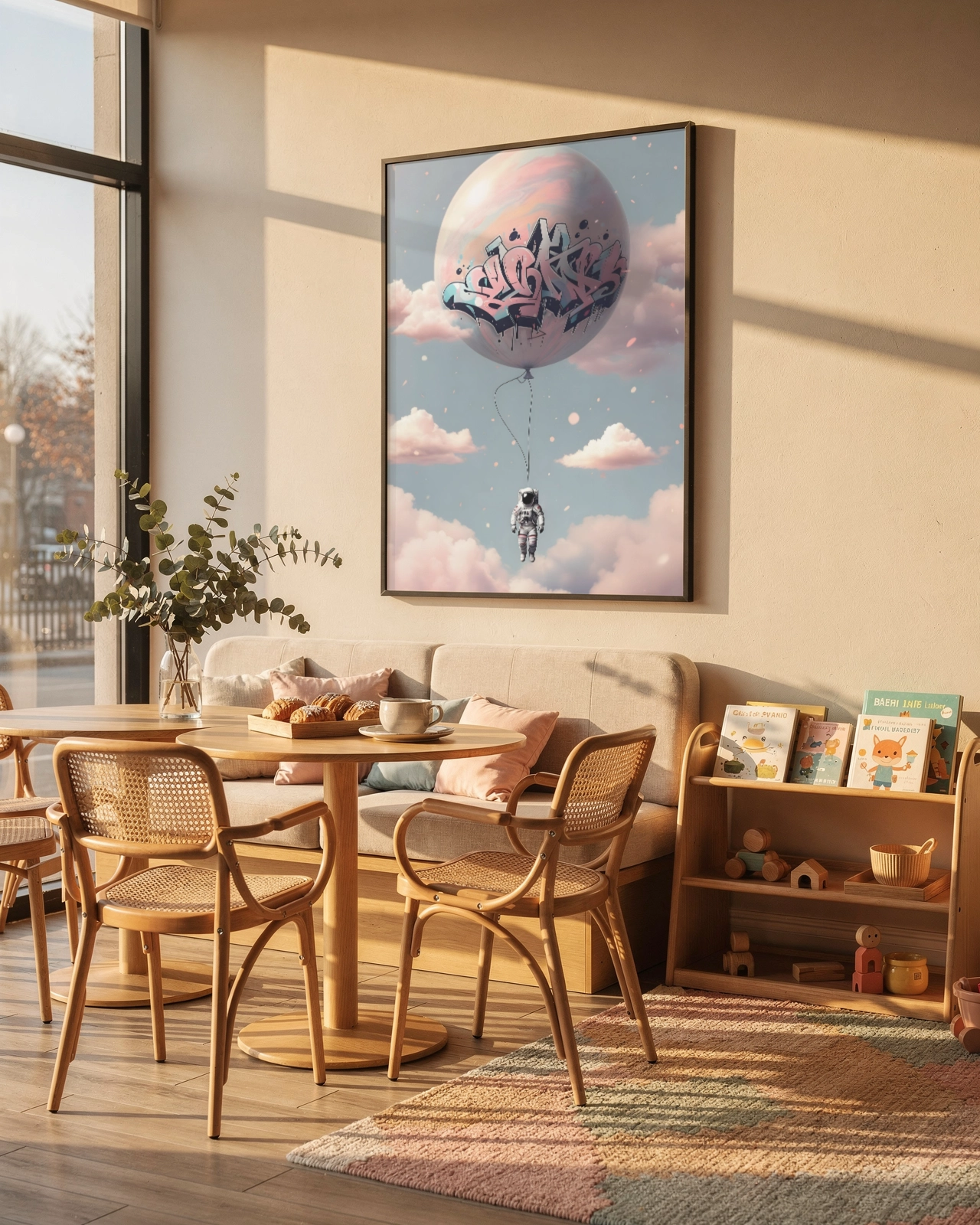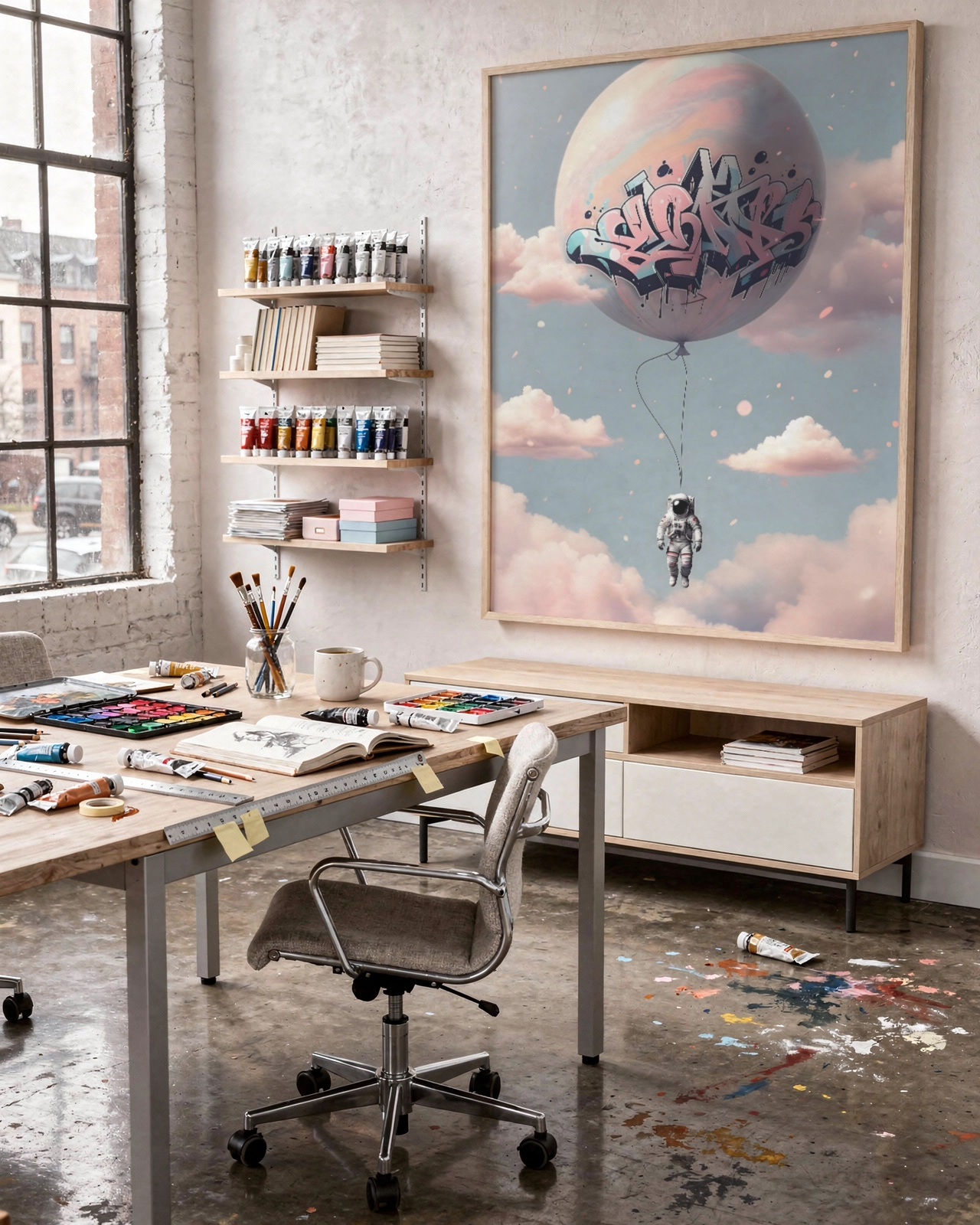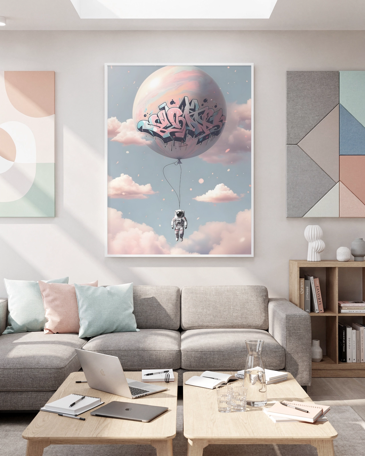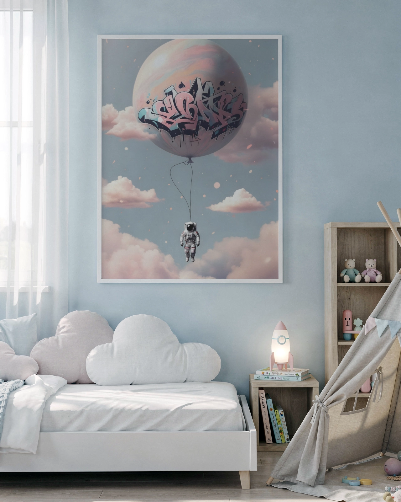 Dans un salon, une chambre ou un espace créatif, cette affiche apporte une ambiance à la fois urbaine et légère. Elle transforme un mur vide en point focal original et donne une sensation d’évasion tout en restant moderne et décorative.