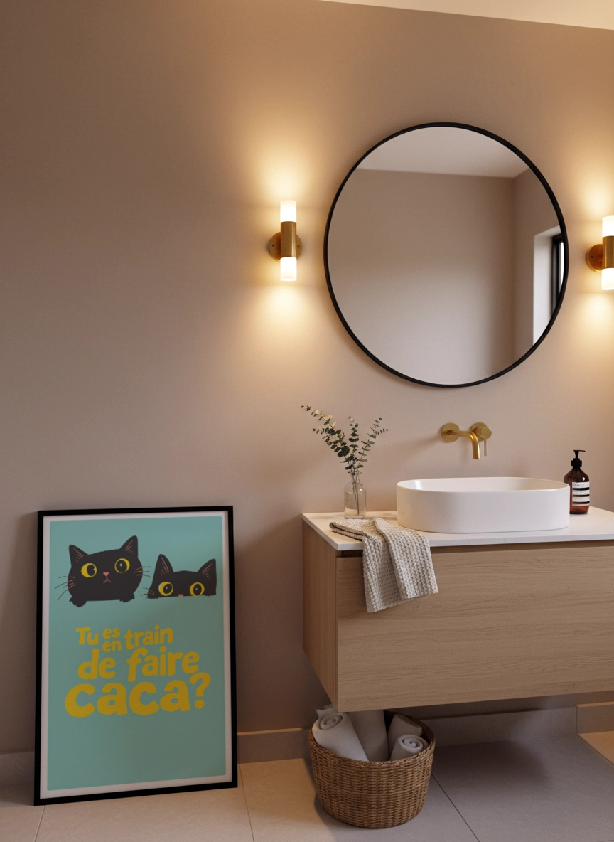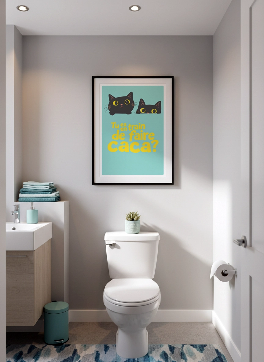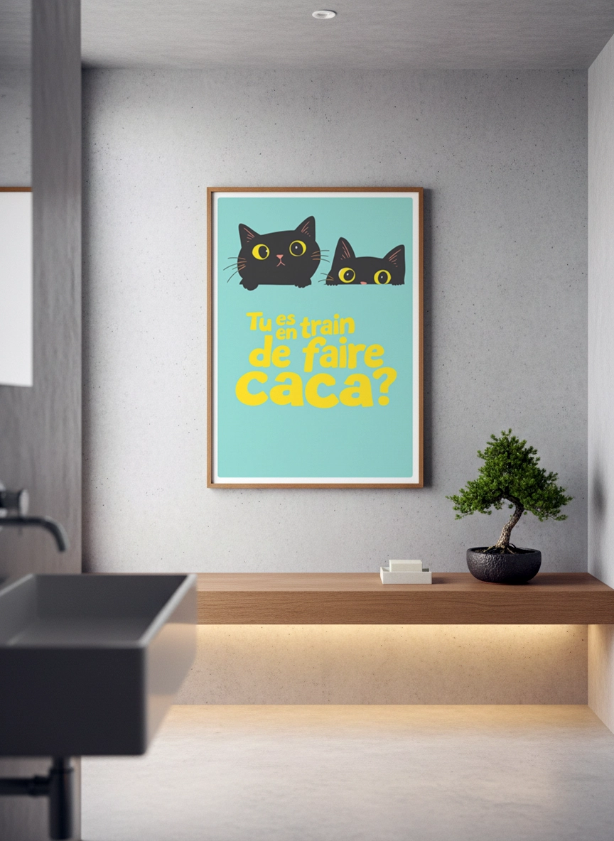 Dans des toilettes, une salle de bain ou un espace invité, cette affiche permet d’installer une ambiance conviviale et décontractée. Elle rend l’espace plus vivant et transforme un mur souvent oublié en détail qui marque.