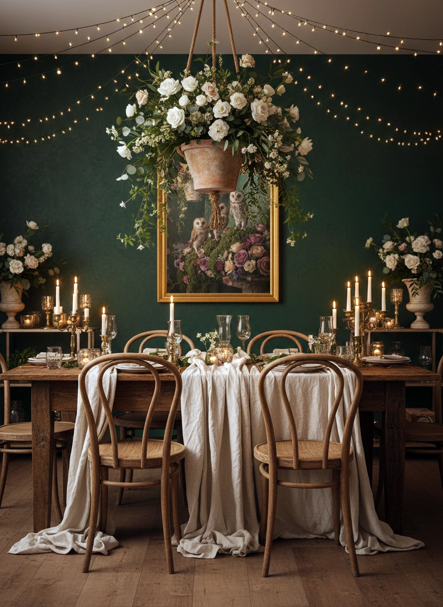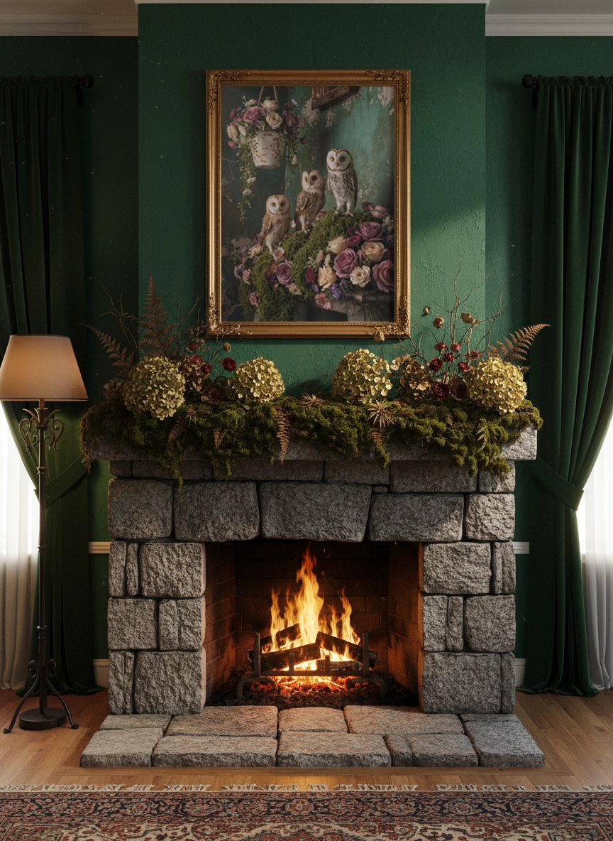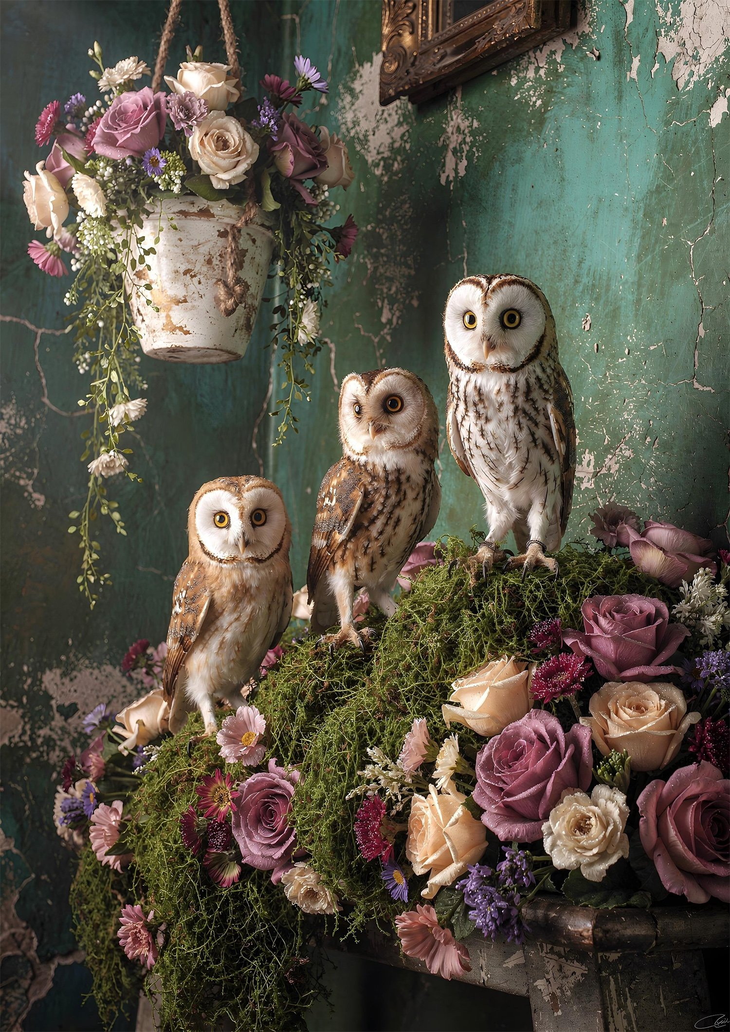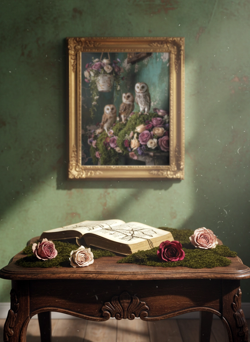 Trois chouettes veillent en silence, posées sur un tapis de mousse, entourées de roses aux teintes poudrées.