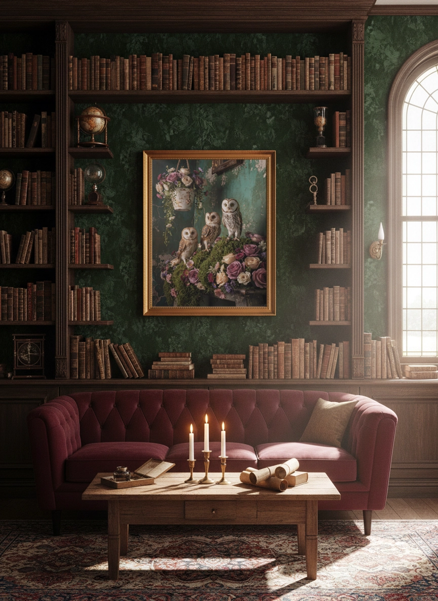 Dans un salon, une chambre ou un coin lecture, elle diffuse une atmosphère apaisante et raffinée. Les regards des chouettes, à la fois sages et curieux, créent un lien immédiat, comme une présence discrète mais réconfortante. Une œuvre qui parle de nature, de silence et d’élégance, parfaite pour celles et ceux qui aiment les intérieurs sensibles et inspirés.
