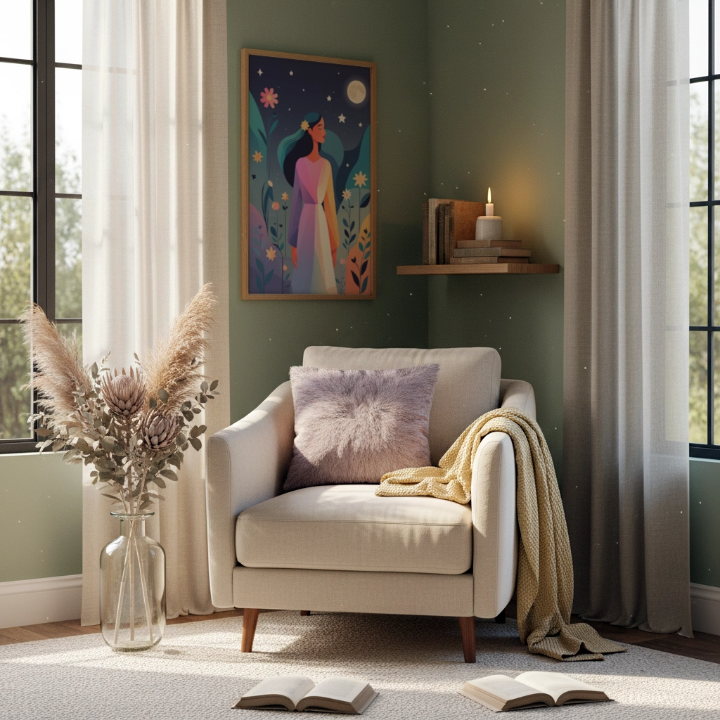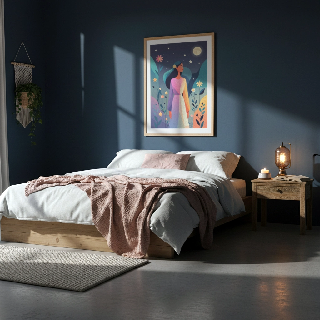 Accrochée dans un salon, une chambre ou un espace de travail, cette illustration diffuse une atmosphère douce et rassurante, propice au calme et à l’évasion.