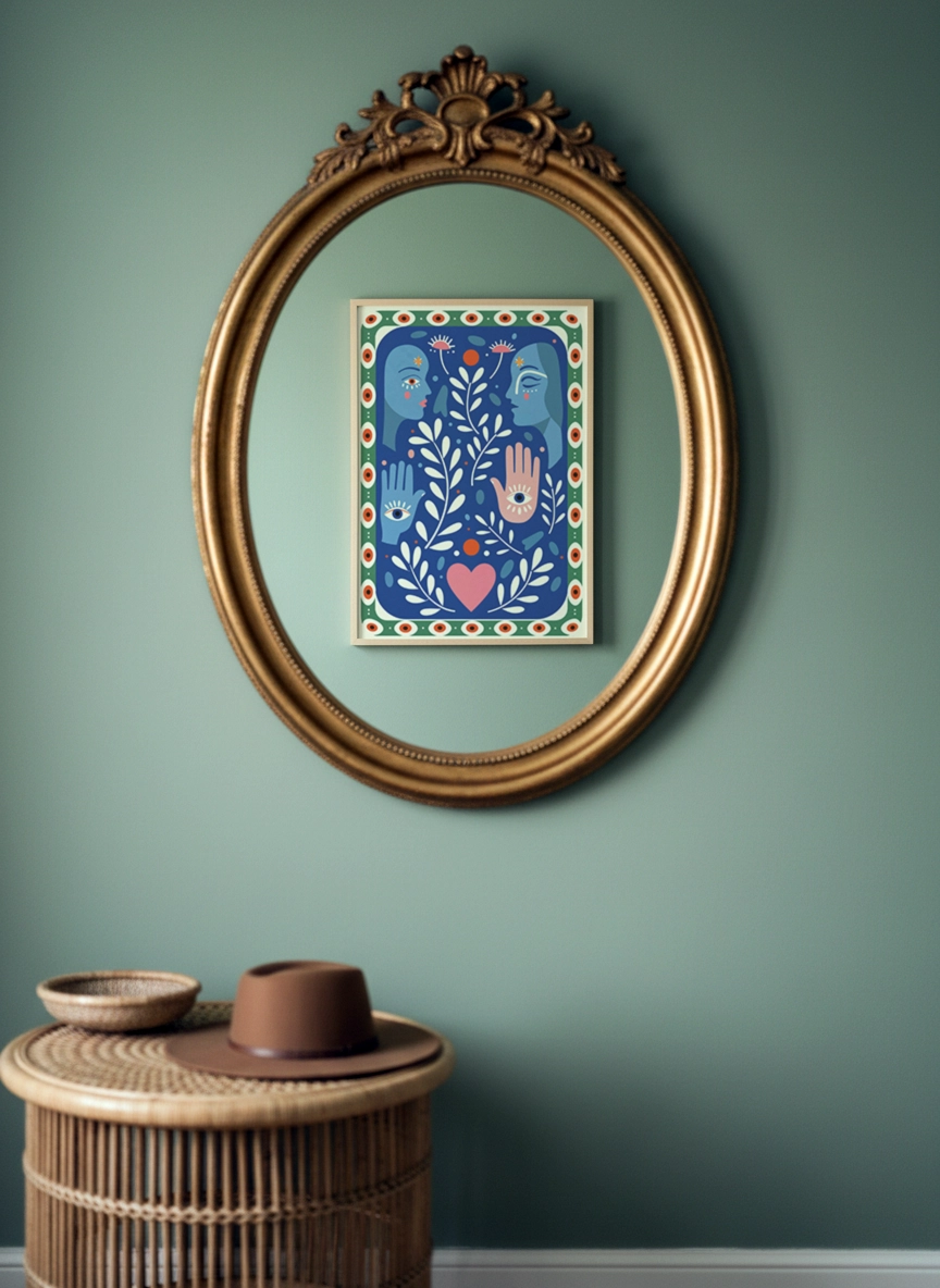 Cette affiche folk art met en scène un univers graphique riche en symboles : visages stylisés, mains protectrices, feuillages et cœur central composent une illustration douce et expressive. L’ensemble évoque l’intuition, la connexion humaine et la nature, dans un style à la fois naïf, poétique et résolument moderne.