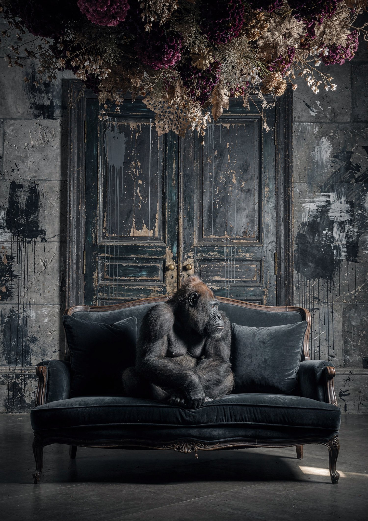 Avec son gorille installé sur un canapé ancien dans un décor sombre et patiné, cette affiche apporte immédiatement une présence visuelle forte à un mur. La composition florale suspendue, les portes vieillies et les tonalités profondes créent une ambiance feutrée, puissante et très décorative, idéale pour habiller un salon, un bureau ou une entrée avec caractère. Cette pièce attire le regard sans surcharger l’espace et trouve naturellement sa place dans un intérieur au style vintage, baroque ou plus affirmé. Une belle affiche pour celles qui aiment les visuels animaux marquants, les contrastes forts et les décors qui donnent du relief à une pièce.