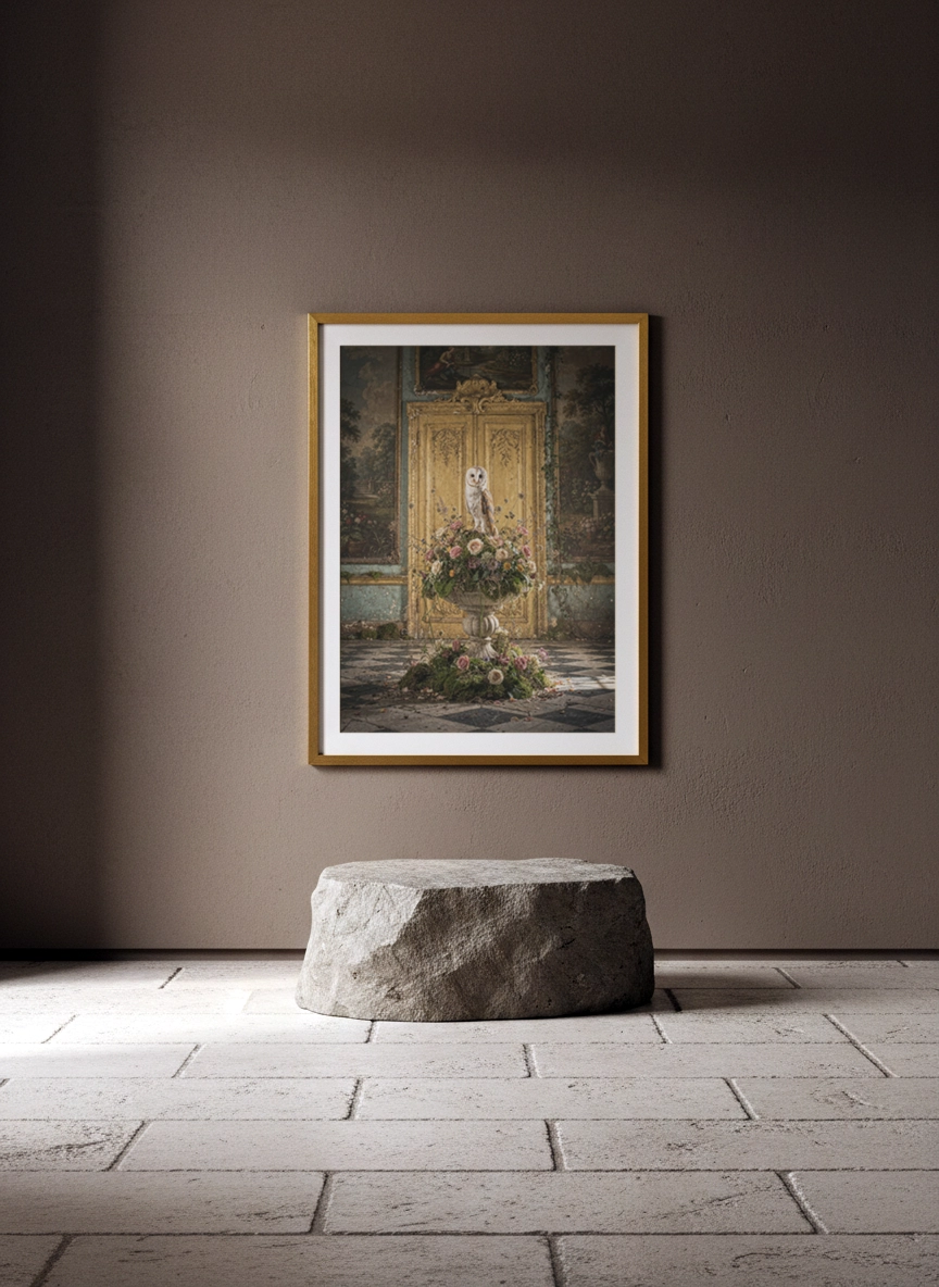Un hibou immobile, perché au sommet d’une composition florale, se détache devant une porte ancienne aux dorures patinées.