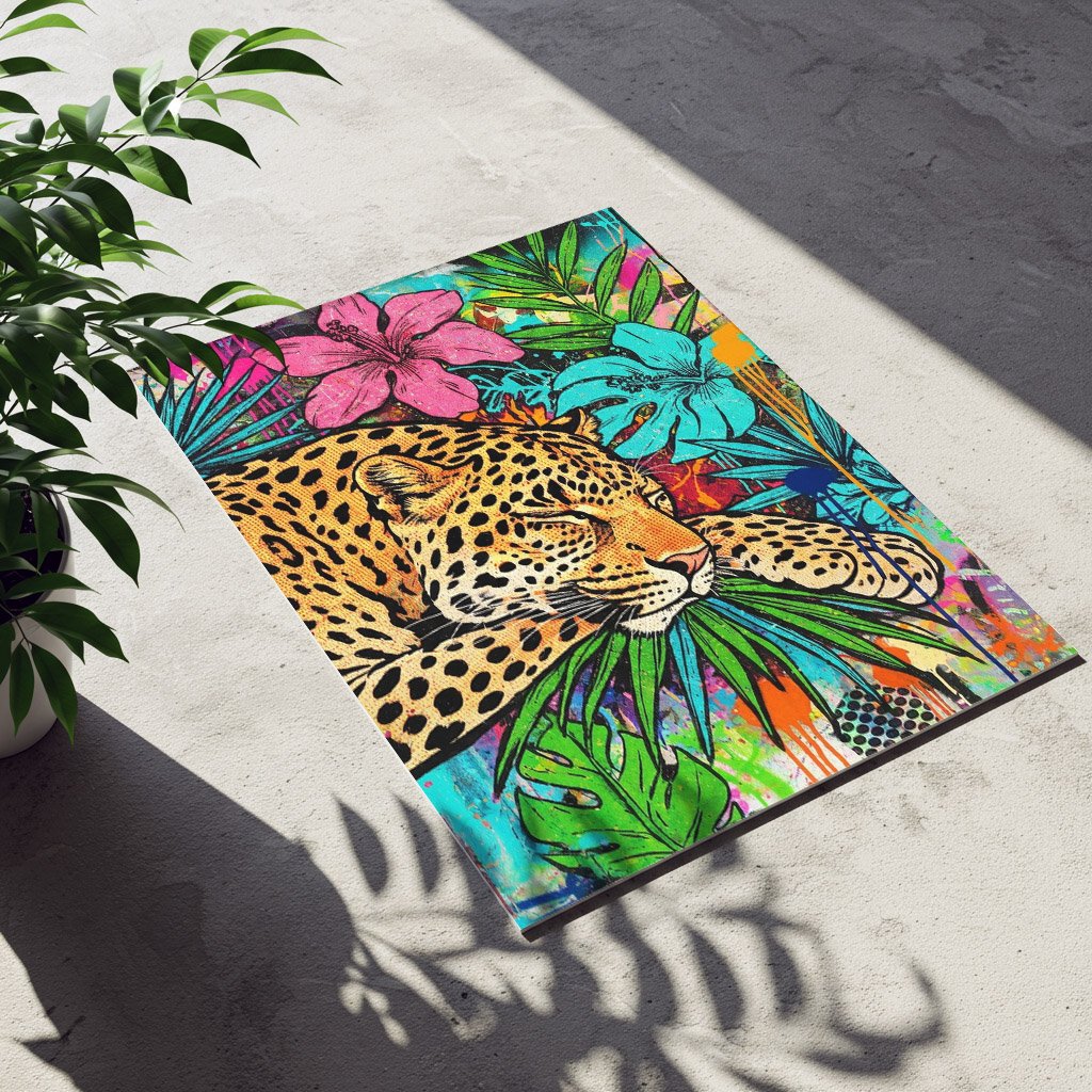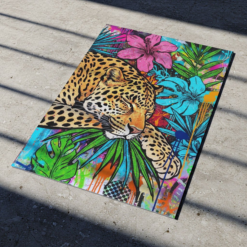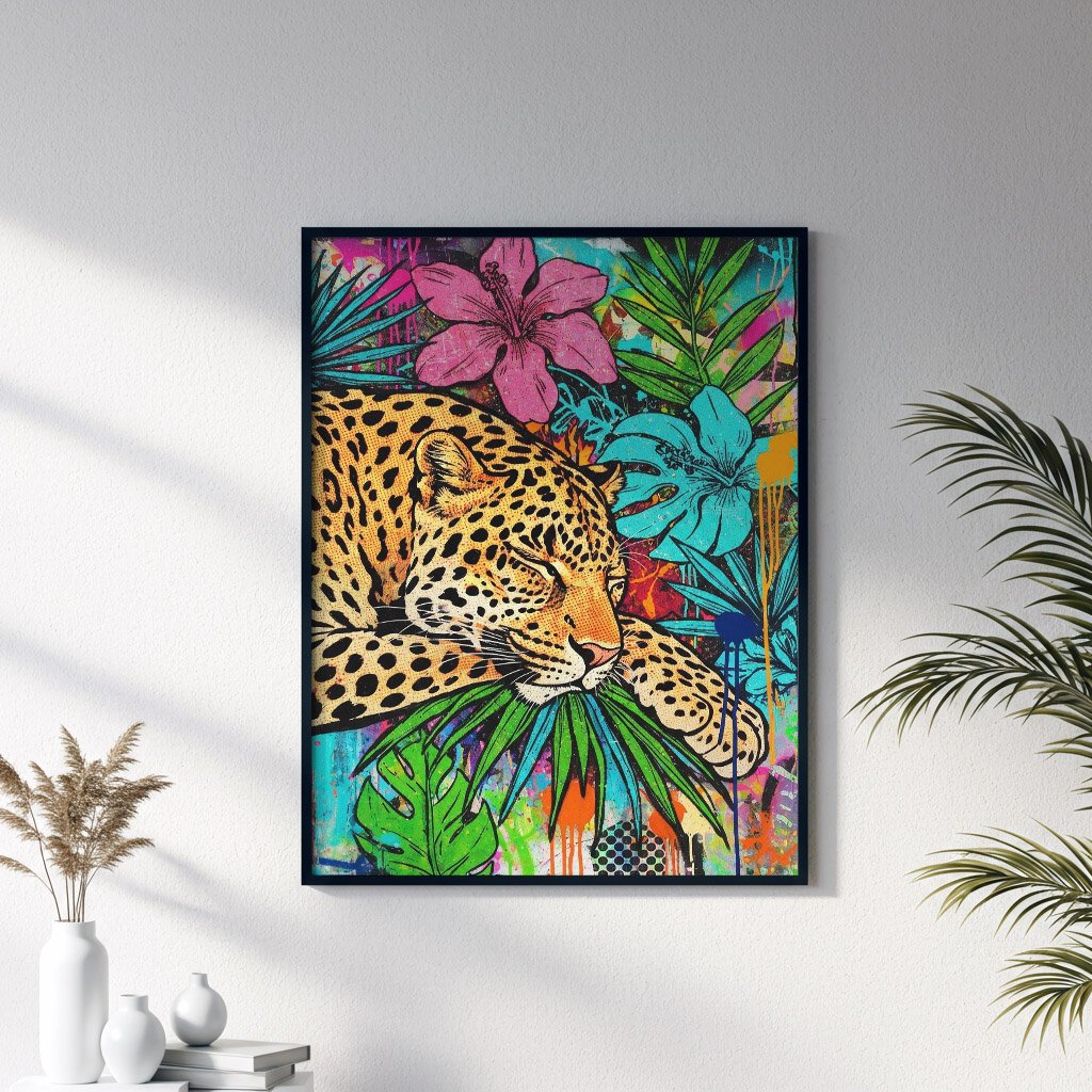 Cette affiche mêle la puissance sauvage de l’animal à une énergie résolument contemporaine, presque urbaine. Les fleurs tropicales, les feuillages luxuriants et les coulures de peinture créent un contraste saisissant entre douceur et intensité.