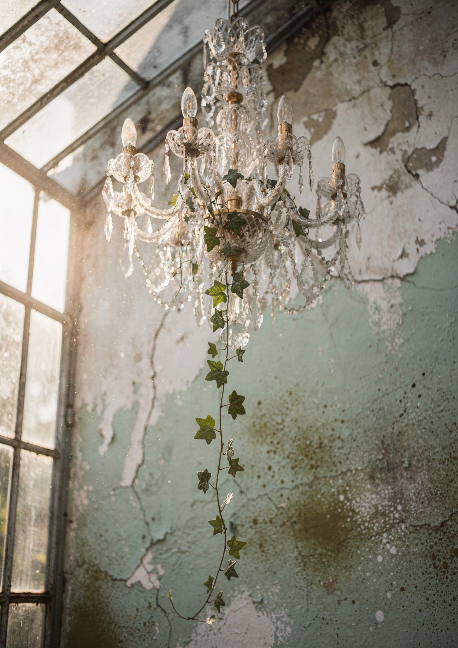 Avec son lustre en cristal suspendu dans une verrière au décor patiné, cette affiche apporte une ambiance douce, lumineuse et pleine de caractère. La lumière naturelle, les murs vieillis et la chute de lierre créent un rendu délicat qui habille facilement un salon, une chambre ou une entrée avec une vraie présence murale. Cette composition trouve naturellement sa place dans un intérieur romantique, vintage ou maison de charme, où elle attire le regard sans alourdir l’espace. Une belle affiche pour celles qui aiment les décors anciens, les détails raffinés et les visuels capables d’apporter de la lumière, du relief et une atmosphère apaisante à une pièce.