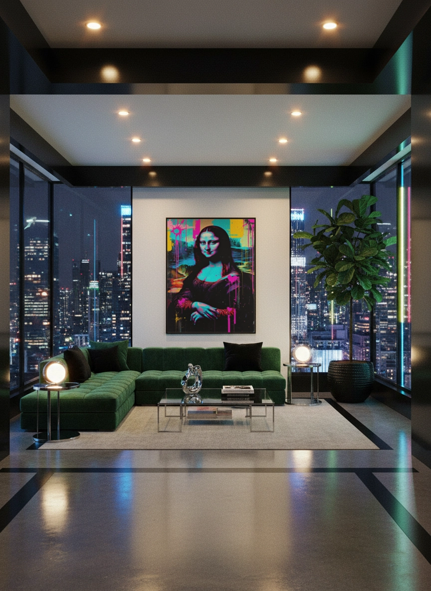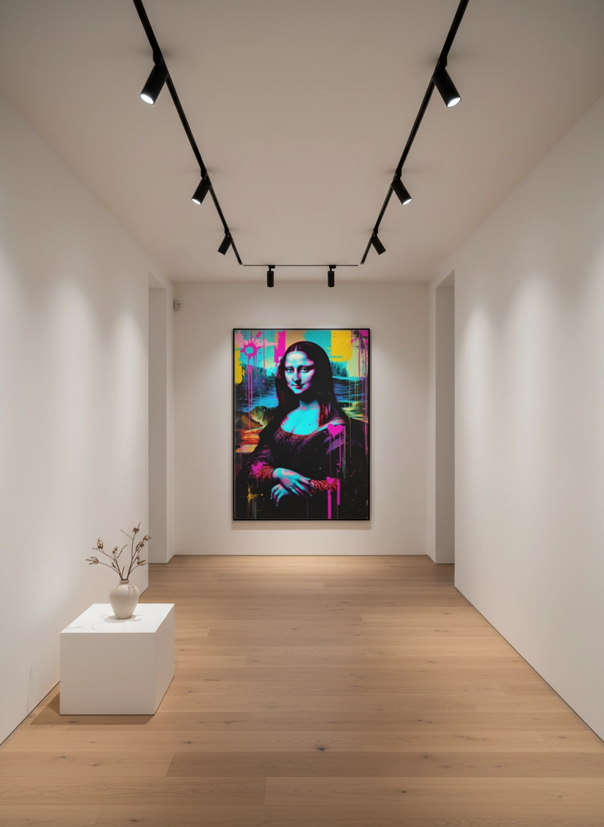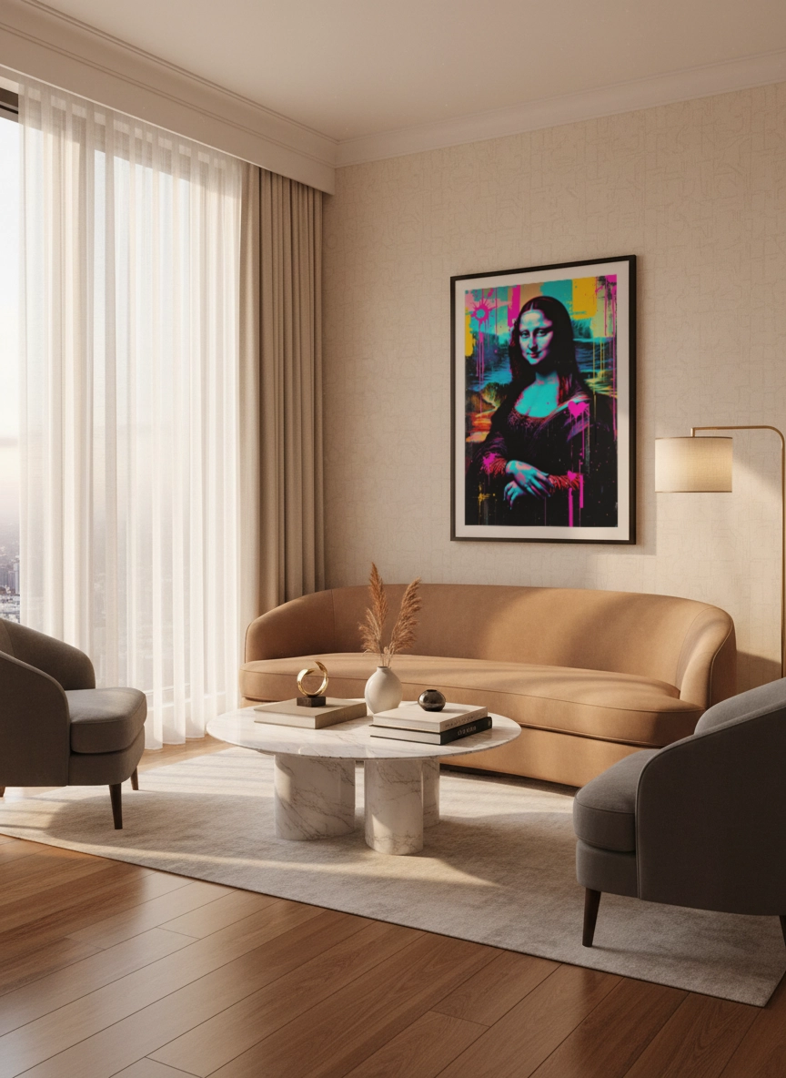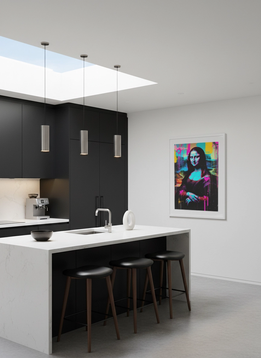 Facile à associer avec des matières brutes, du métal, du bois ou des tons neutres, elle équilibre bien un intérieur moderne. En petit format, elle complète un mur galerie ; en grand format (jusqu’au A0), elle structure l’espace au-dessus d’un canapé, d’un meuble TV ou d’une console.