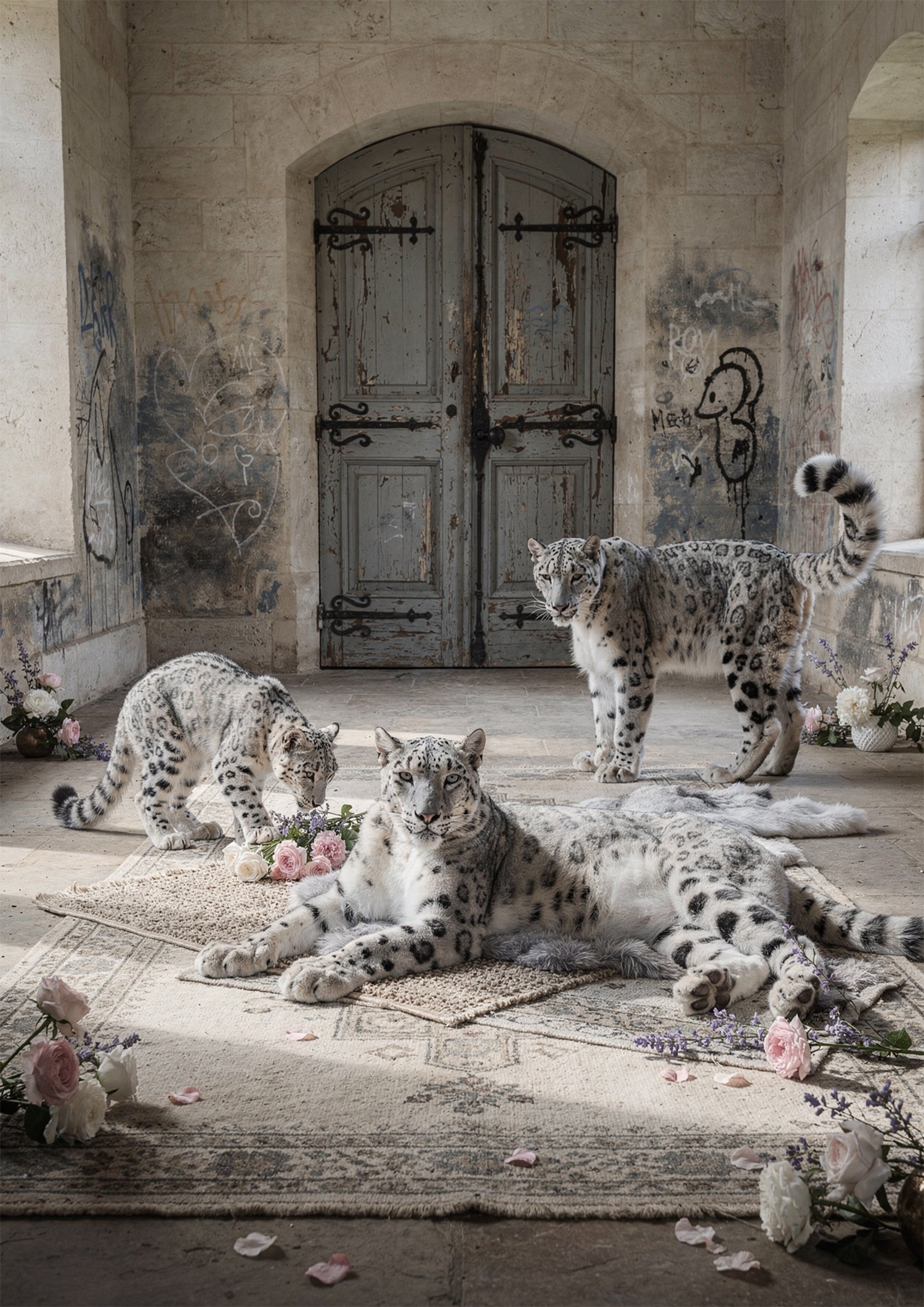 Avec ses panthères des neiges installées dans un décor ancien aux tons clairs, cette affiche apporte une présence murale forte tout en gardant une ambiance calme et soignée. La pierre patinée, la grande porte vieillie, le tapis clair et les touches florales créent un contraste très décoratif, idéal pour habiller une entrée, un salon ou un bureau avec relief. Cette composition attire immédiatement le regard sans alourdir l’espace et donne à la pièce un style animalier plus travaillé, entre douceur visuelle et puissance tranquille. Une belle affiche pour celles qui aiment les intérieurs de caractère, les félins majestueux et les scènes animales qui marquent vraiment un mur.