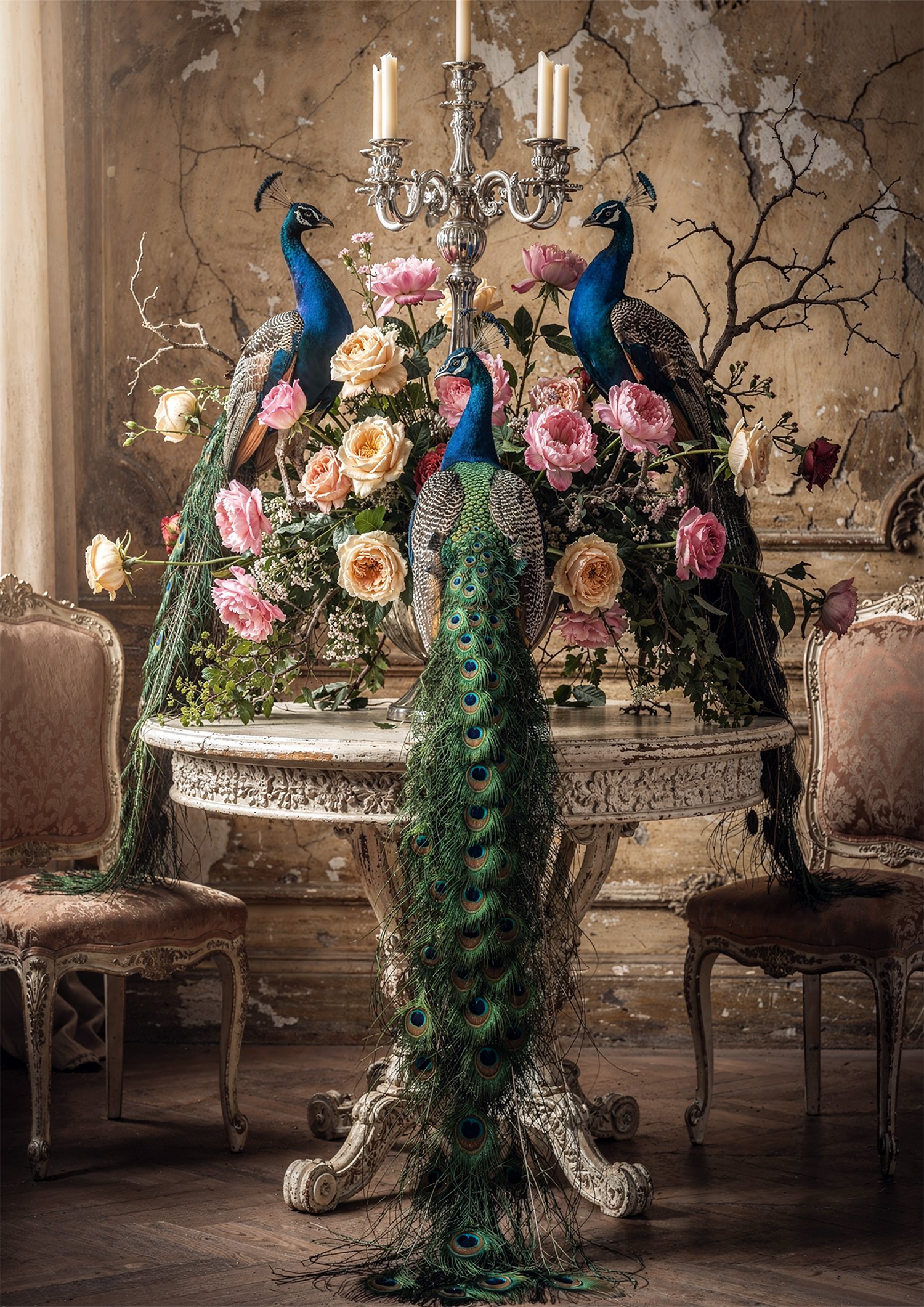 Trois paons, majestueux et silencieux, veillent autour d’un bouquet généreux comme une promesse : roses poudrées, nuances pêche, feuillages délicats… le tout posé sur une table patinée, dans une pièce qui semble avoir gardé la mémoire des fêtes d’autrefois. On devine le craquement du parquet, la douceur d’une lumière dorée, et cette élégance un peu mélancolique des murs anciens.
