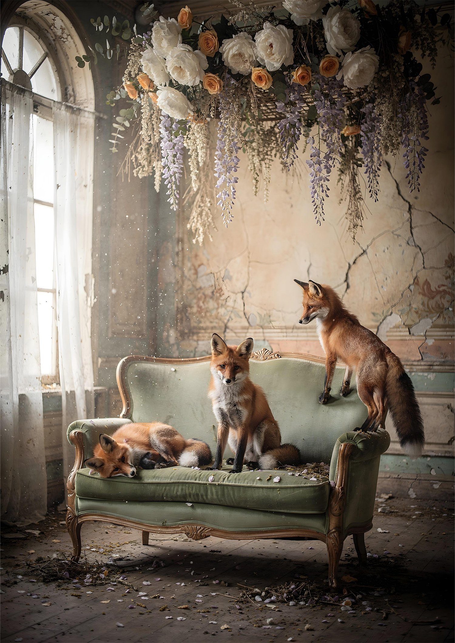 Dans une pièce oubliée par le temps, la lumière glisse à travers une grande fenêtre, accroche la poussière en suspension et adoucit les murs écaillés comme une vieille fresque. Sur un canapé vert, trois renards prennent la pose : l’un somnole, l’autre vous regarde droit dans les yeux, et le troisième s’étire avec cette élégance insolente des animaux libres. Au-dessus, une guirlande de fleurs déborde — blancs crémeux, roses abricot, glycines mauves — comme un plafond de jardin suspendu.