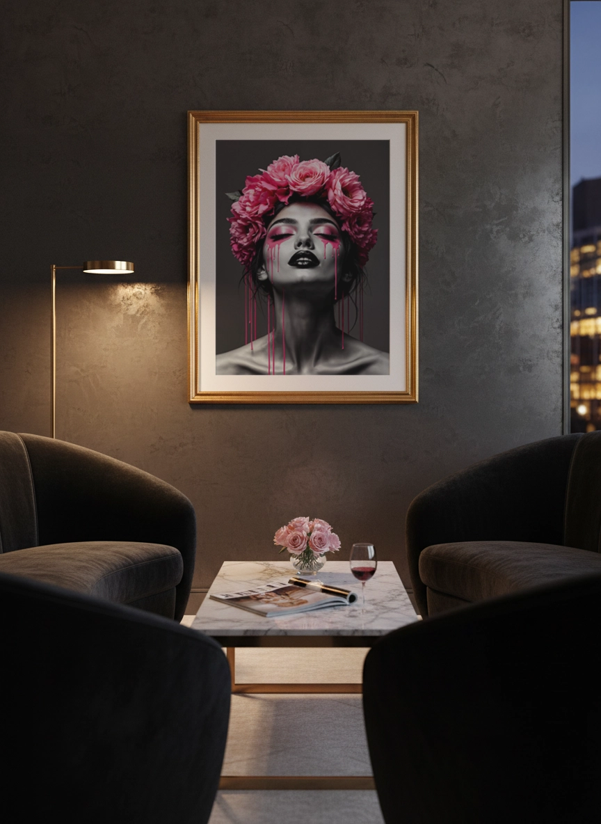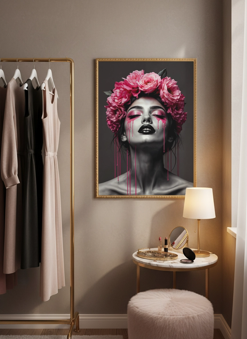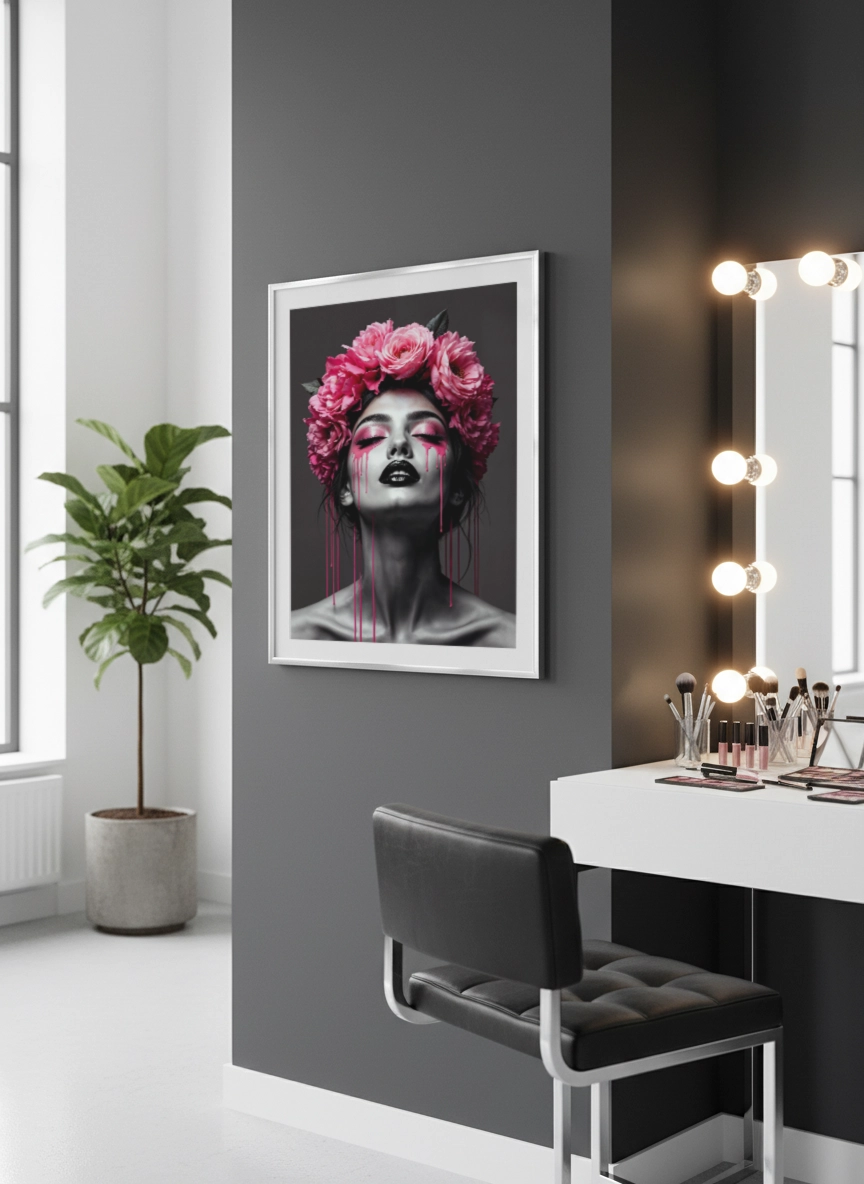Elle s’accorde facilement avec des tons neutres, du noir, du rose poudré ou des matières comme le velours et le bois. En petit format, elle complète une composition murale ; en grand format (jusqu’au A0), elle structure le mur au-dessus d’une commode, d’un lit ou d’un coin maquillage, sans surcharger.