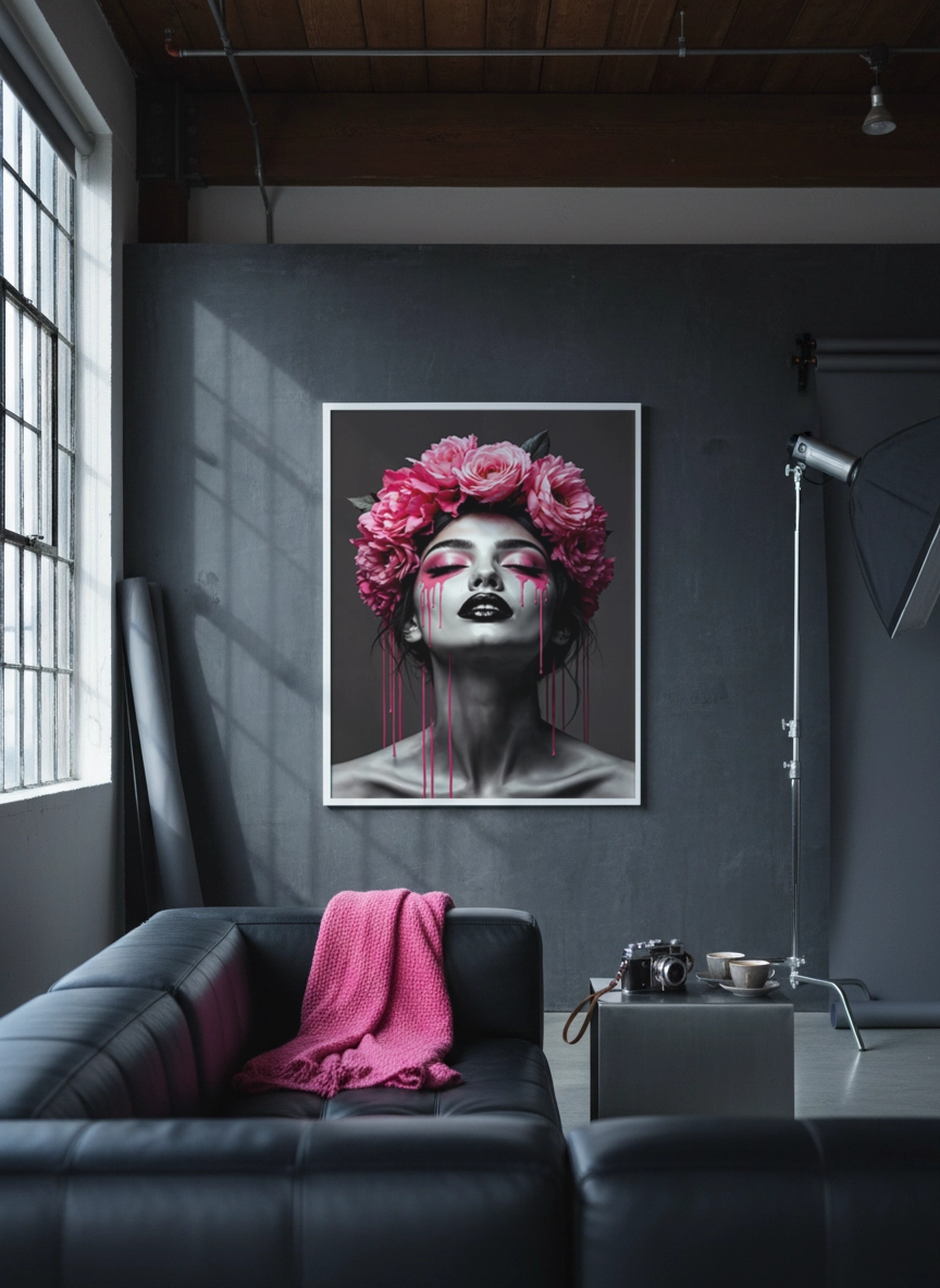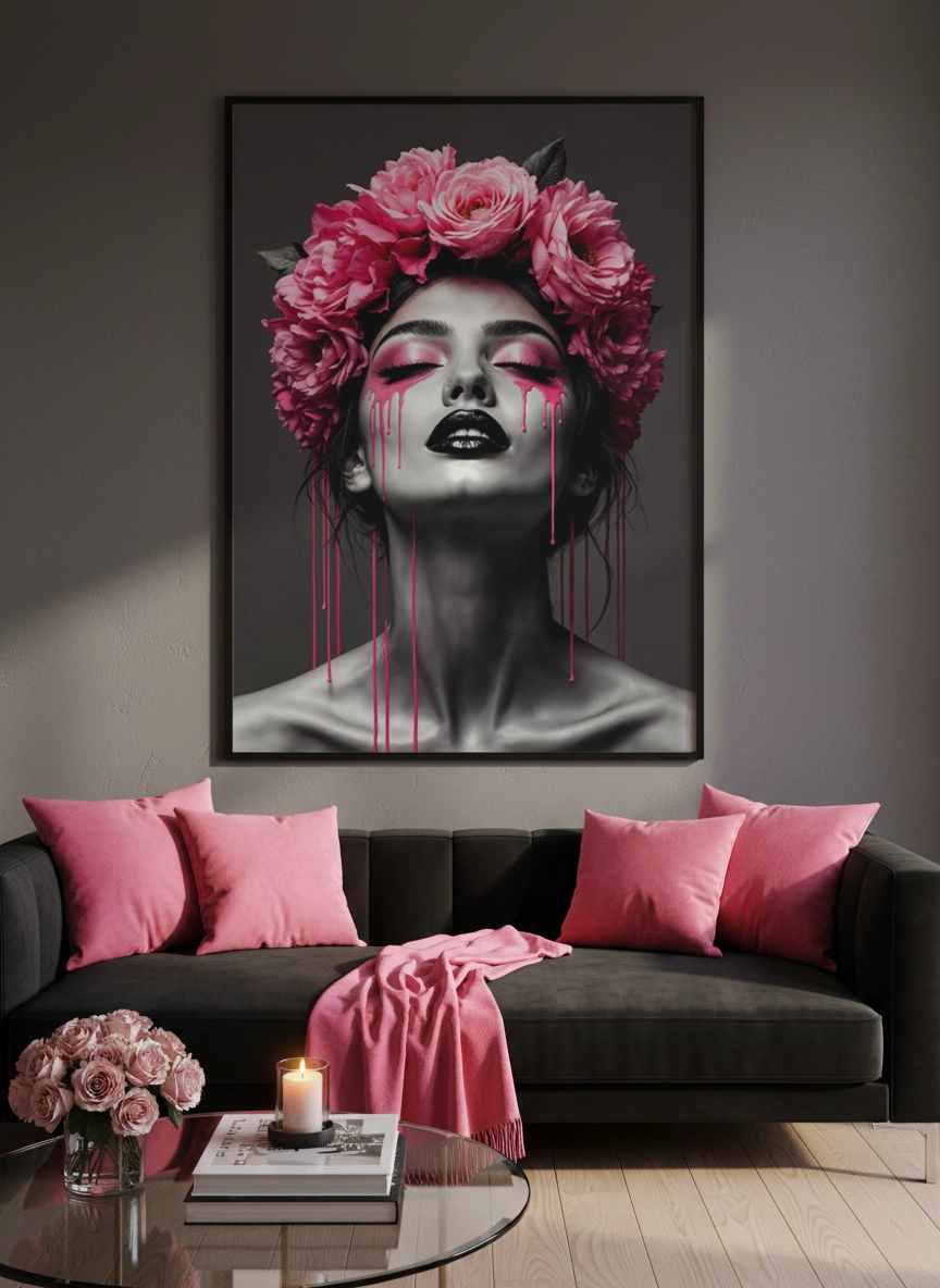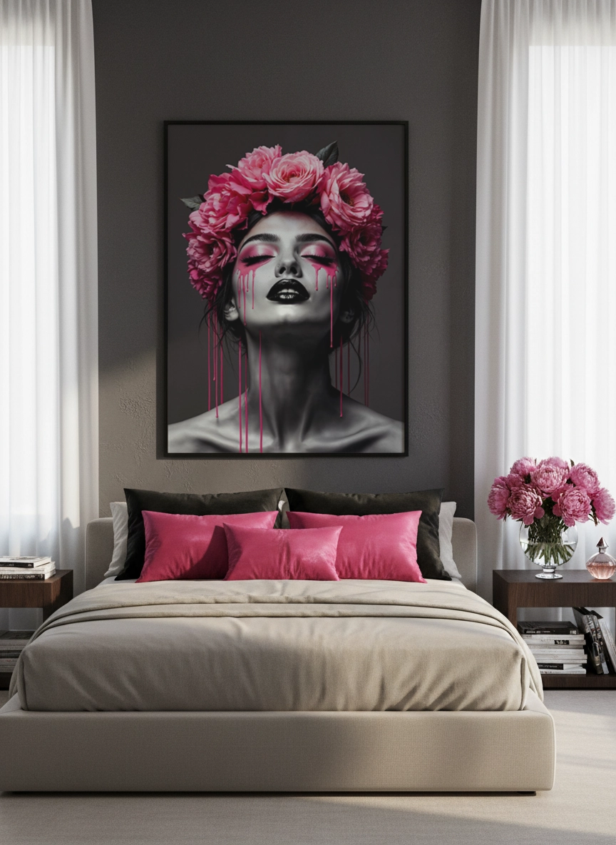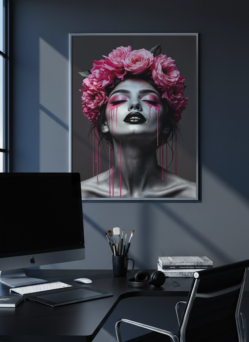 Elle s’accorde facilement avec des tons neutres, du noir, du rose poudré ou des matières comme le velours et le bois. En petit format, elle complète une composition murale ; en grand format (jusqu’au A0), elle structure le mur au-dessus d’une commode, d’un lit ou d’un coin maquillage, sans surcharger.