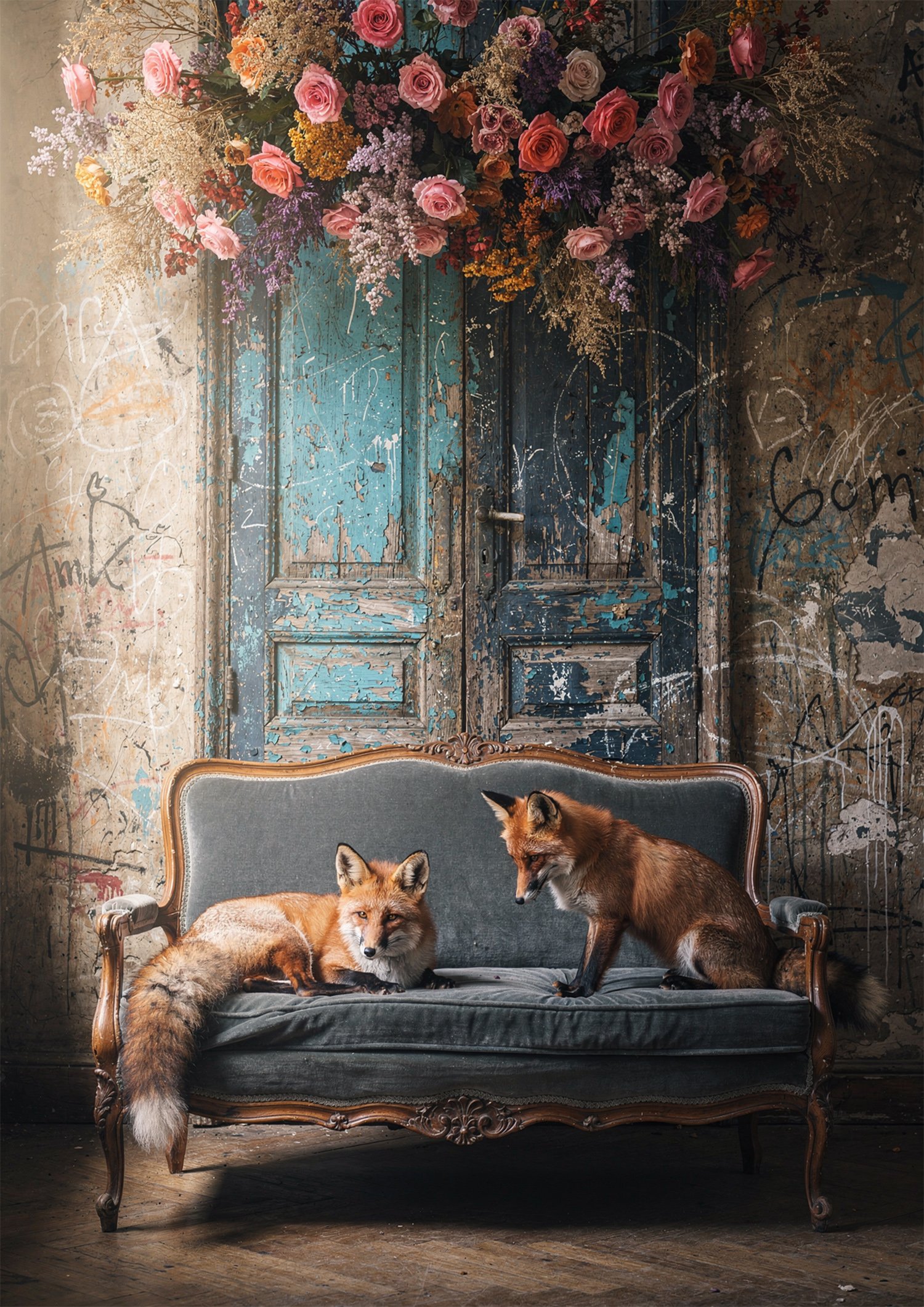 Avec ses deux renards installés sur un canapé ancien, cette affiche apporte immédiatement du caractère à un mur. Le décor patiné, la porte bleue vieillie et l’imposante composition florale créent une ambiance à la fois sauvage, décorative et pleine de contraste. Elle trouve facilement sa place dans un salon, une entrée ou un bureau, où elle attire le regard sans alourdir l’espace. Cette pièce est idéale pour celles qui aiment les visuels animaux forts, les décors vintage et les ambiances originales qui donnent plus de relief à une pièce. Une belle affiche pour habiller un mur avec une présence affirmée et chaleureuse.
