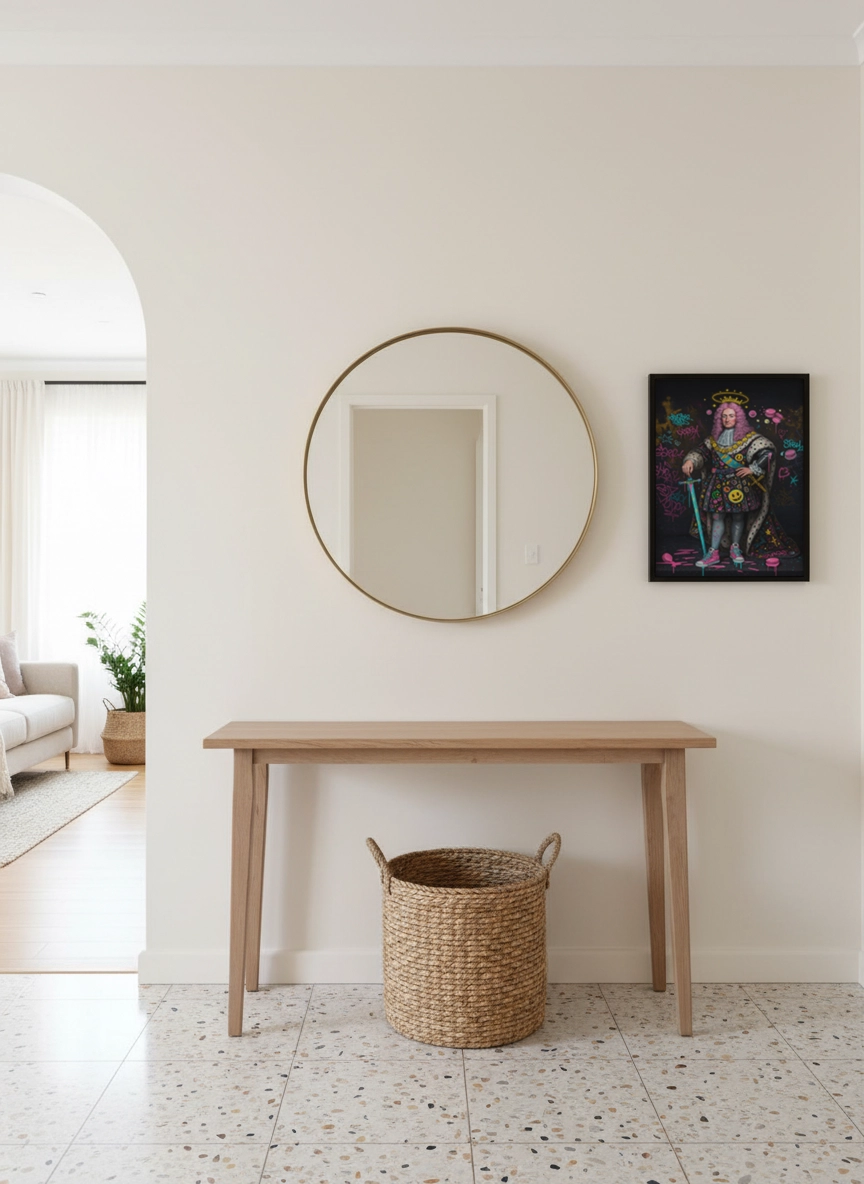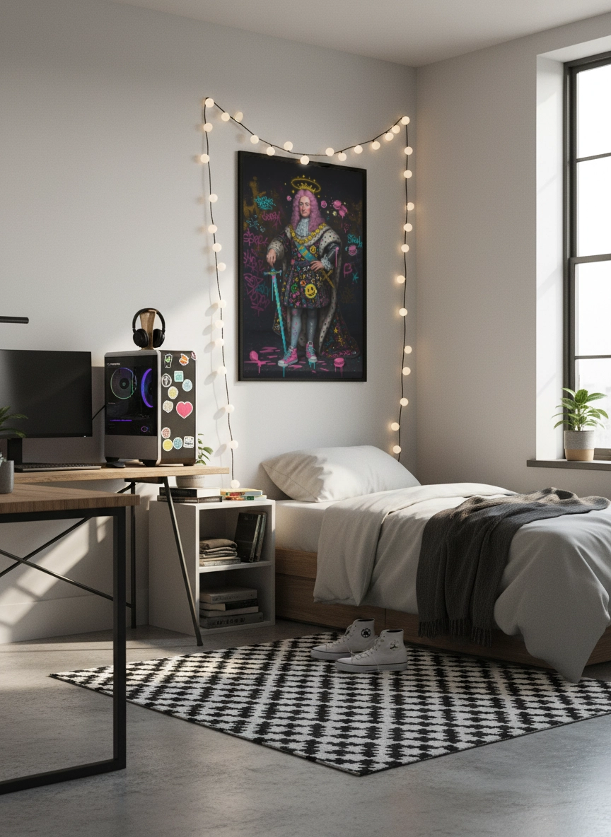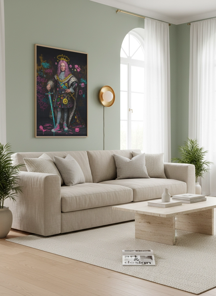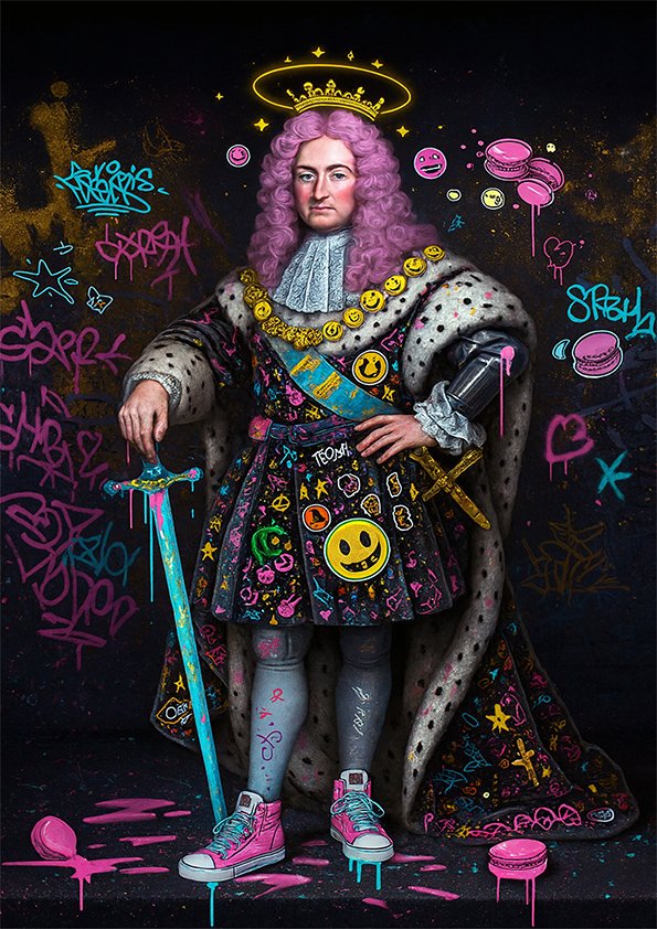 La couronne devient halo lumineux, la tenue aristocratique se couvre de graffitis, de smileys et de traces presque enfantines. L’épée, les baskets roses, les détails peints à la main composent un langage visuel libre, irrévérencieux, profondément contemporain. Le contraste entre héritage historique et culture urbaine crée une œuvre aussi provocante que fascinante.