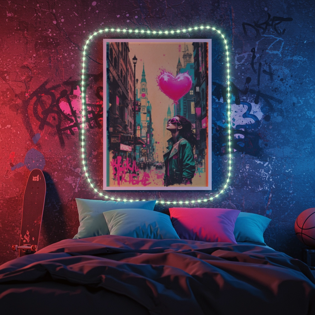 Cette affiche capture l’énergie brute de la rue mêlée à une poésie inattendue. Les façades urbaines, les enseignes lumineuses et les touches de peinture éclaboussée créent un décor vibrant, presque électrique.