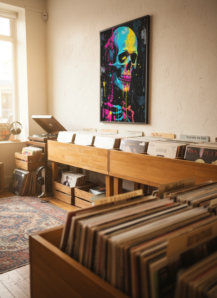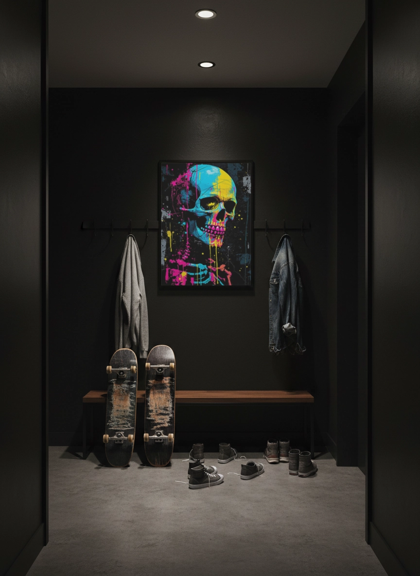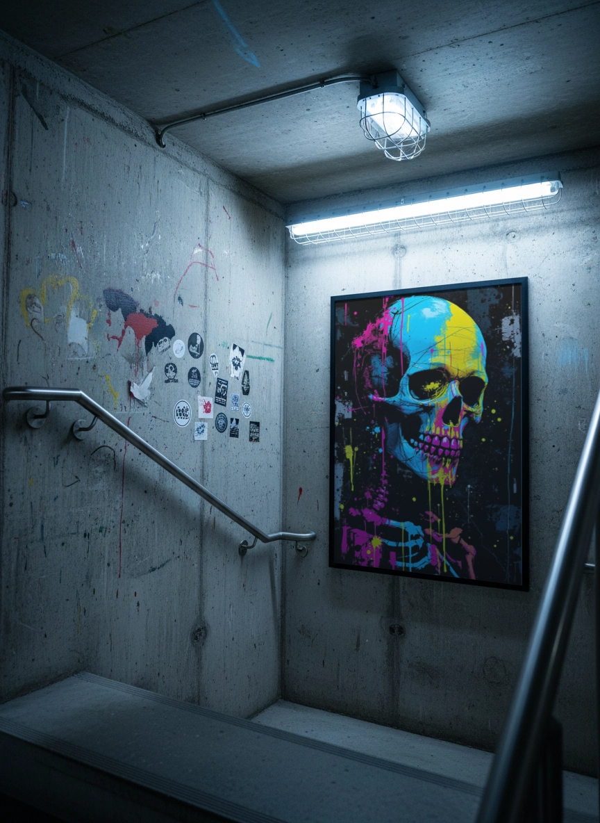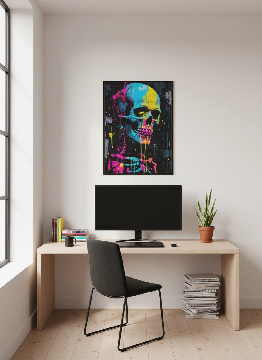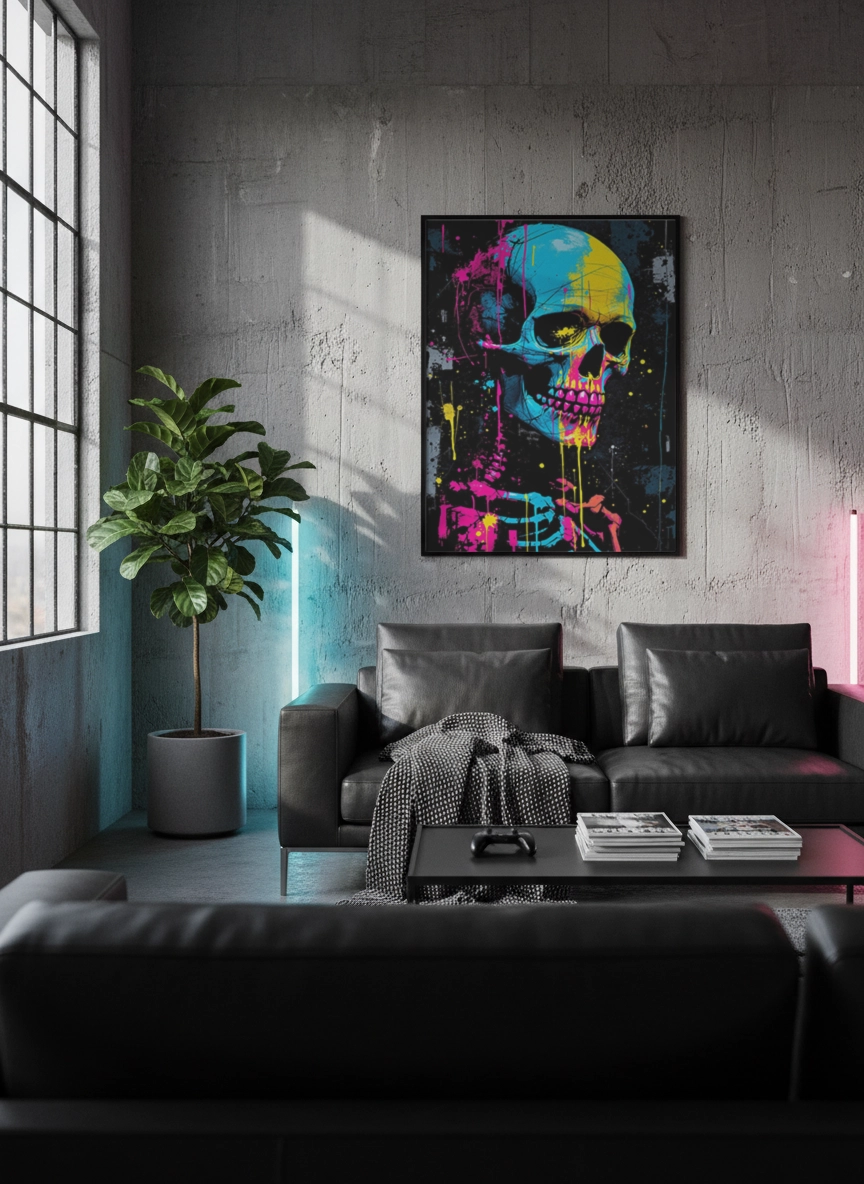 Dans un salon contemporain, un bureau ou un espace créatif, cette affiche apporte une ambiance urbaine et audacieuse. Elle transforme un mur vide en point focal puissant et donne immédiatement du caractère à la pièce.