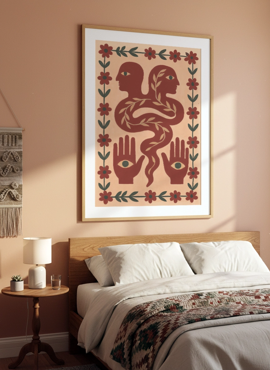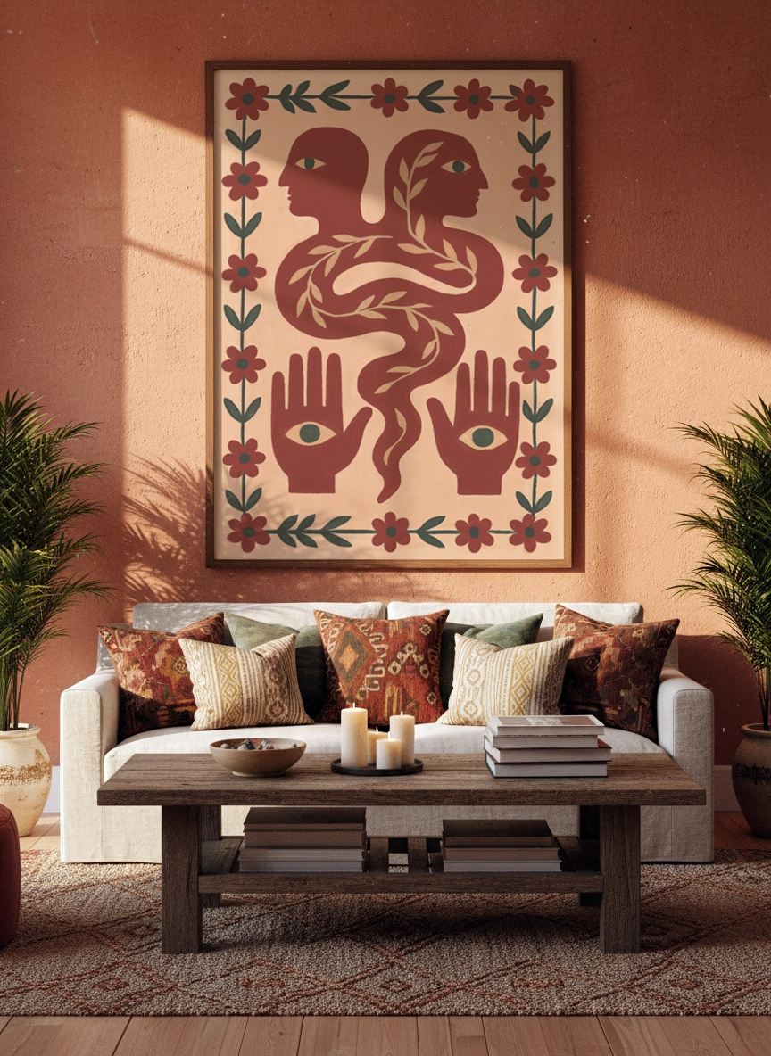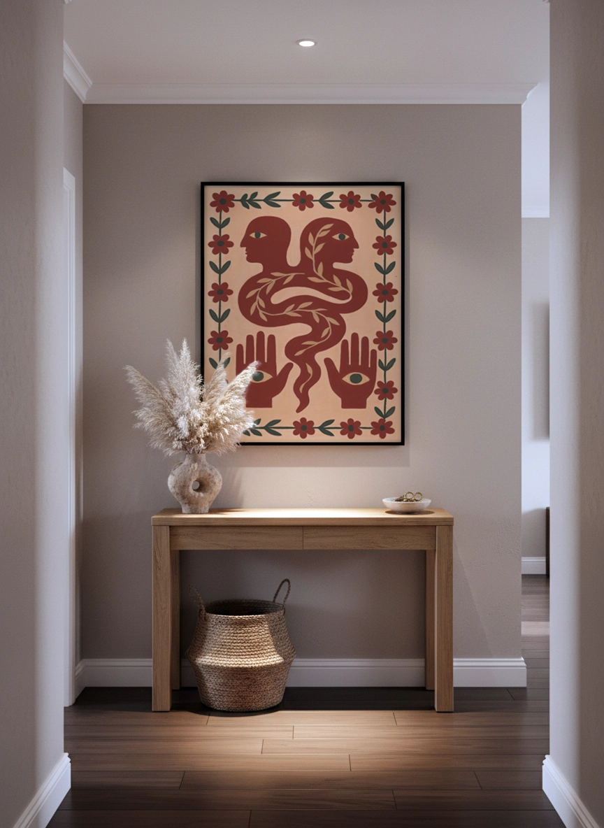 Dans un salon, au-dessus d’une console ou près d’une bibliothèque, elle installe une atmosphère plus chaleureuse et personnelle. Elle se marie bien avec des matières naturelles, des teintes sable, terracotta, vert olive, et une déco simple.