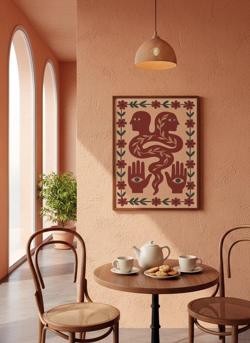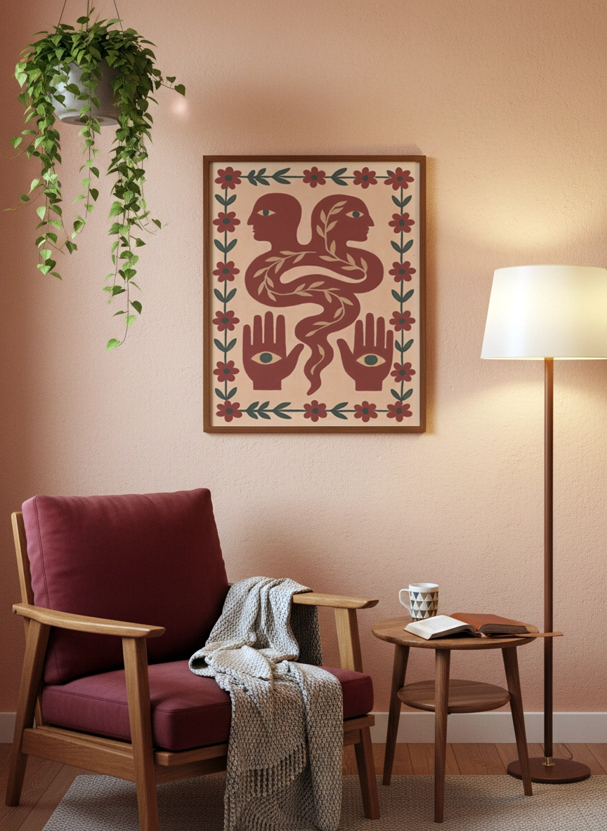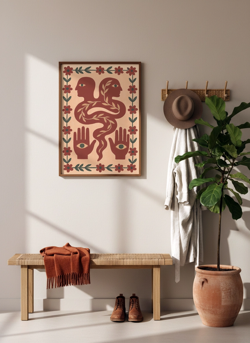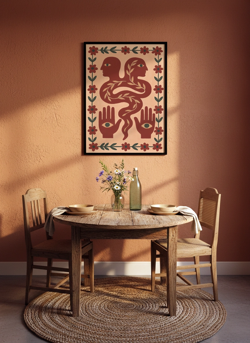 Dans un salon, au-dessus d’une console ou près d’une bibliothèque, elle installe une atmosphère plus chaleureuse et personnelle. Elle se marie bien avec des matières naturelles, des teintes sable, terracotta, vert olive, et une déco simple.