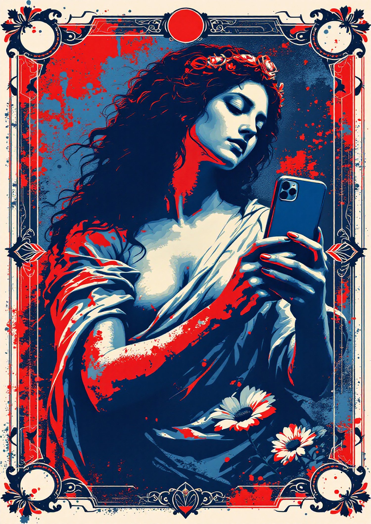 Une figure féminine inspirée de l’art classique, drapée de douceur et de silence, est absorbée par l’écran lumineux de son smartphone. Le geste est simple, presque intime, mais le contraste est saisissant.