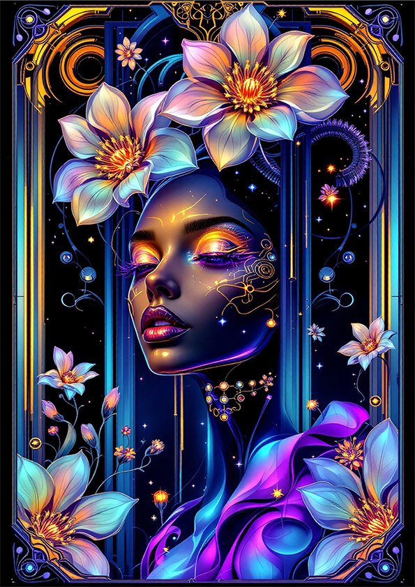 Le portrait d’une femme, baigné de nuances violettes, bleues et dorées, semble émerger d’un monde onirique où les fleurs s’illuminent comme des constellations. Son regard fermé, paisible, invite au calme et à l’introspection, tandis que les lignes graphiques et les touches lumineuses apportent une énergie résolument contemporaine.