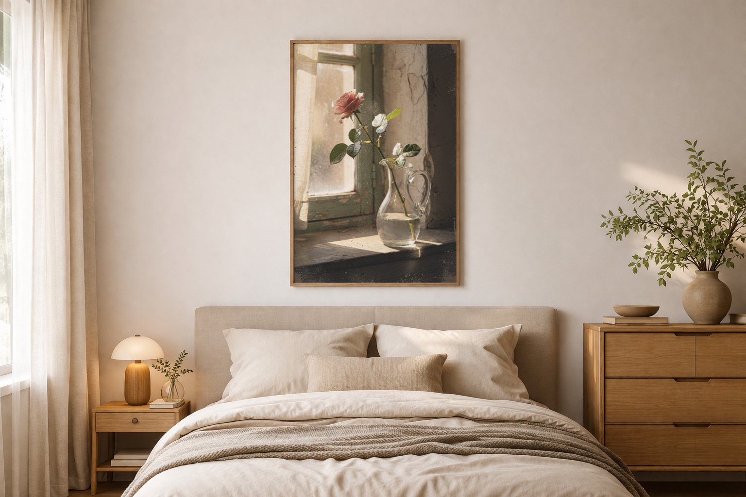 Dans une chambre, la taille compte, mais l’ambiance compte encore plus. Un format intermédiaire est souvent le plus simple à intégrer. Il habille le mur sans durcir la pièce. Les visuels floraux, poétiques ou Art nouveau fonctionnent bien lorsqu’on cherche quelque chose de doux, enveloppant, mais pas effacé.